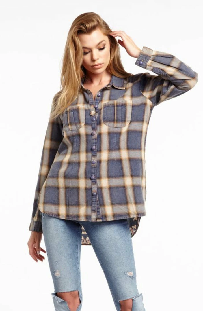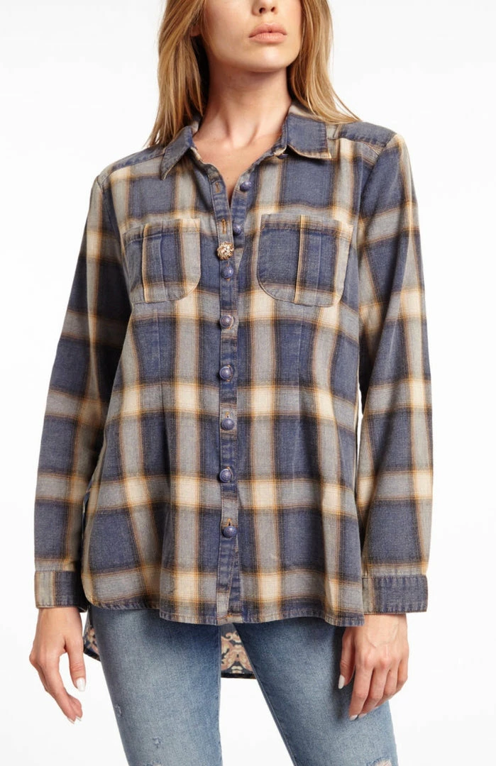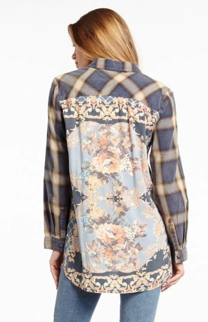 I love Lucy revamped shirt with a beautiful sparkly button, high low hem, beautiful floral print on back.
