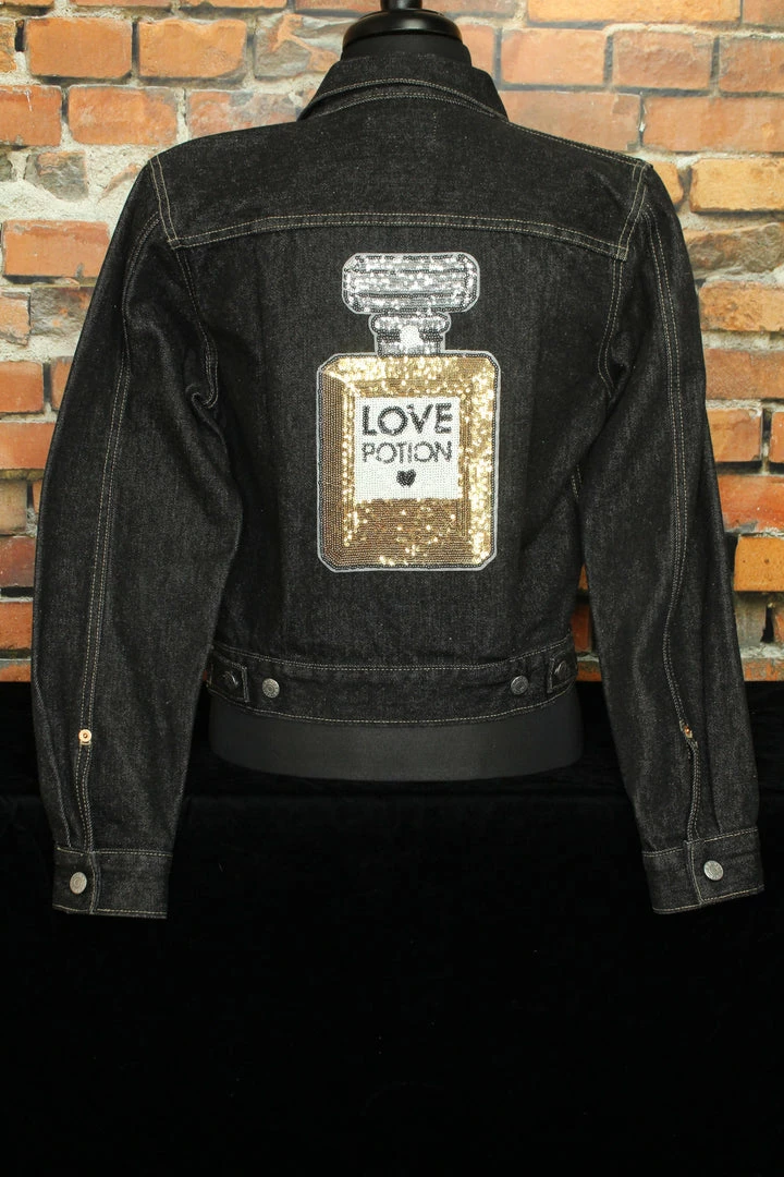 Sequined cherries on the front and sequined Love Potion bottle on the back.