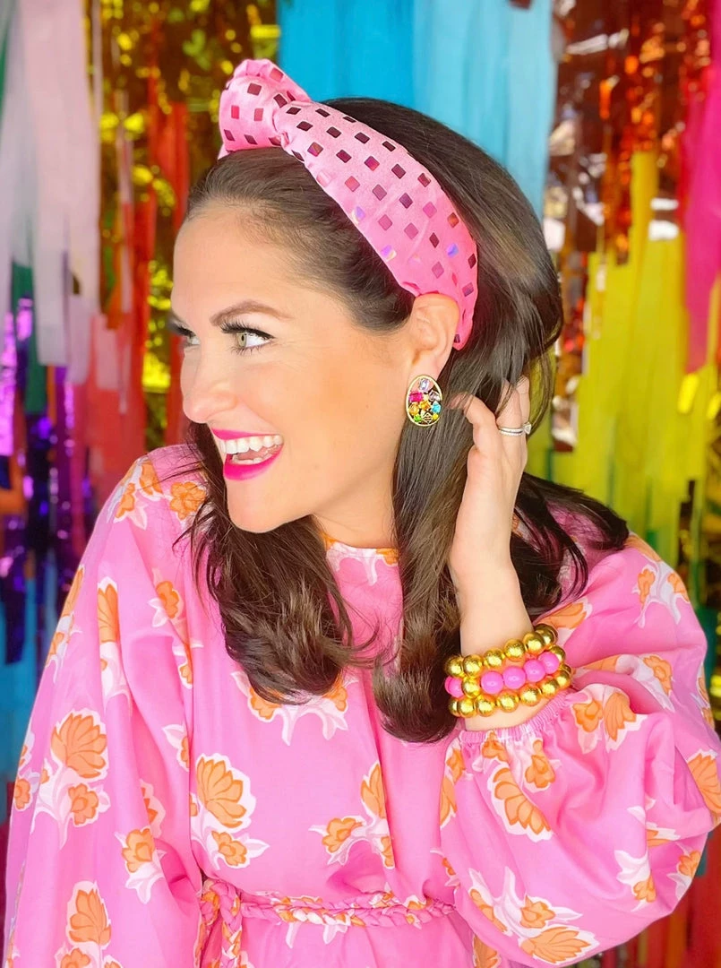 - Pink paddedΒ headband with metallic squaresΒ