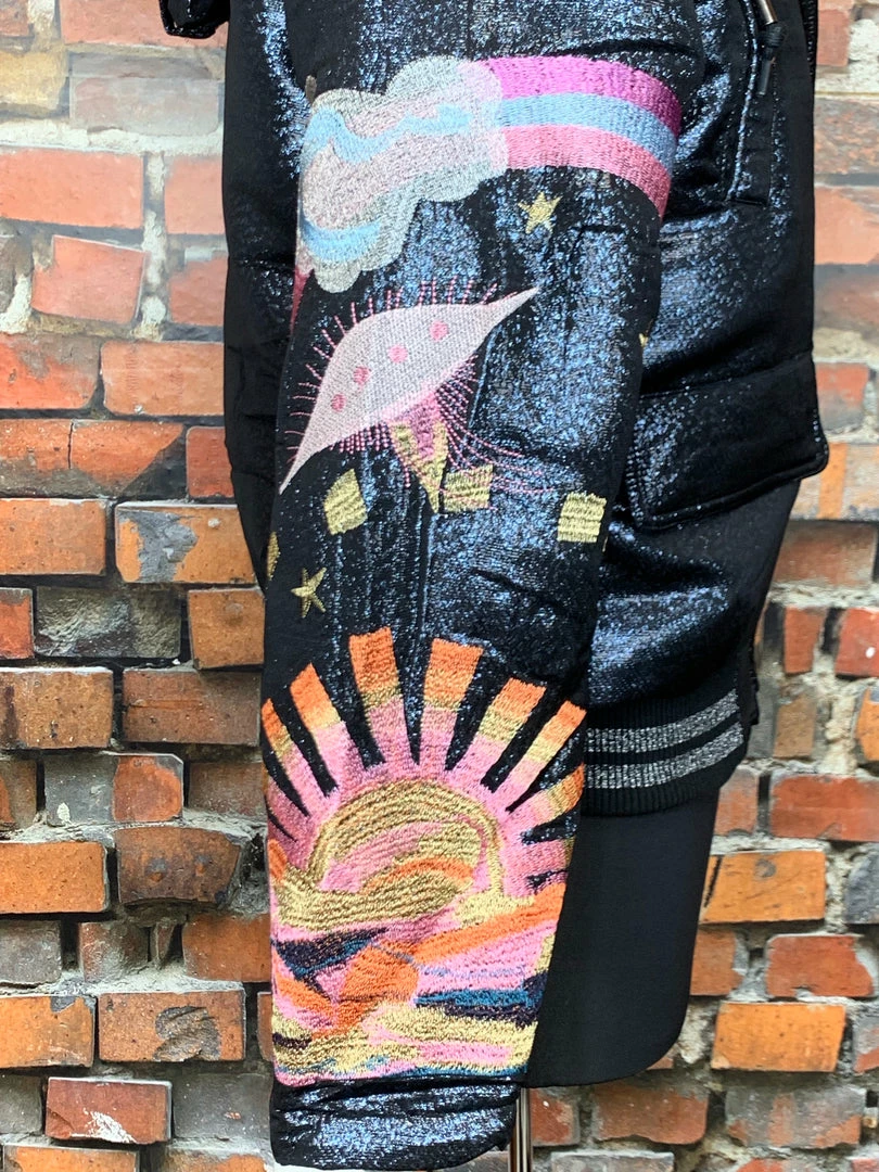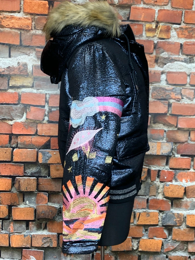 Designed in Spain by Custo Barcelona. Β Navy/black metallic with beautiful embroidery on sleeve. Β Hood with faux fur. Β The 36 fit me with a little extra room. Β In US sizing I wear a medium and or a 8/10