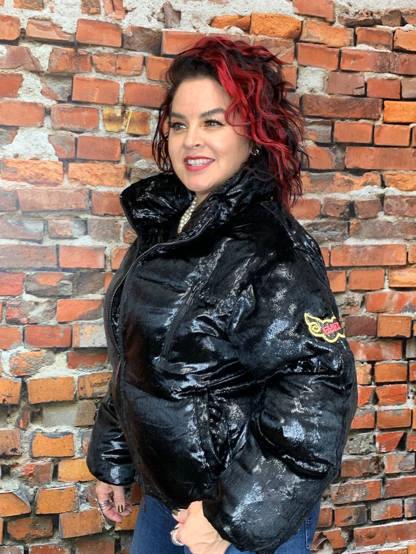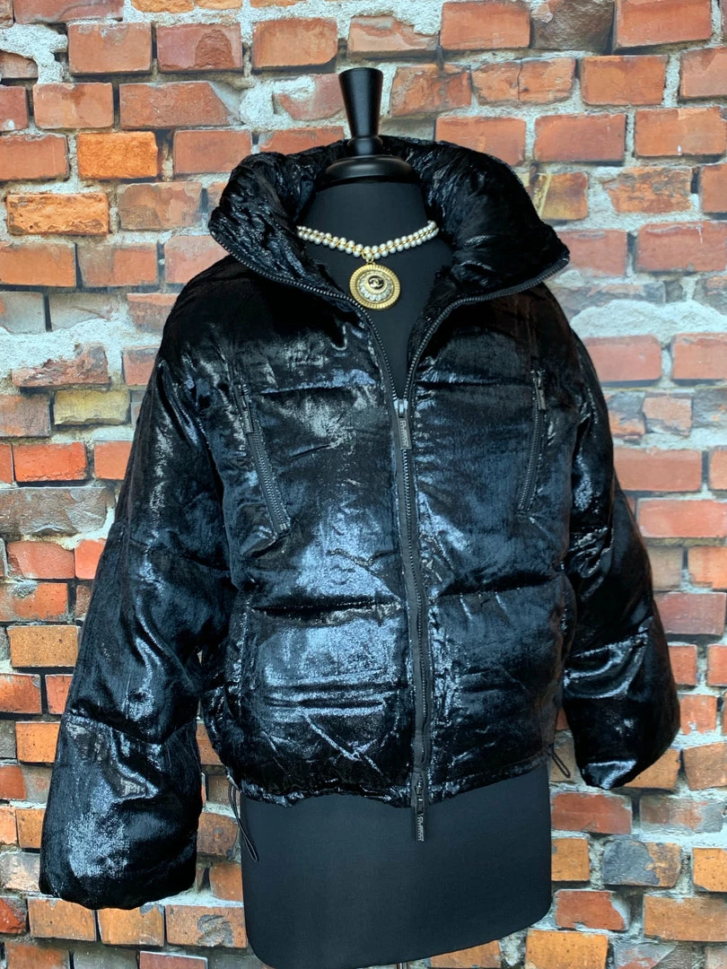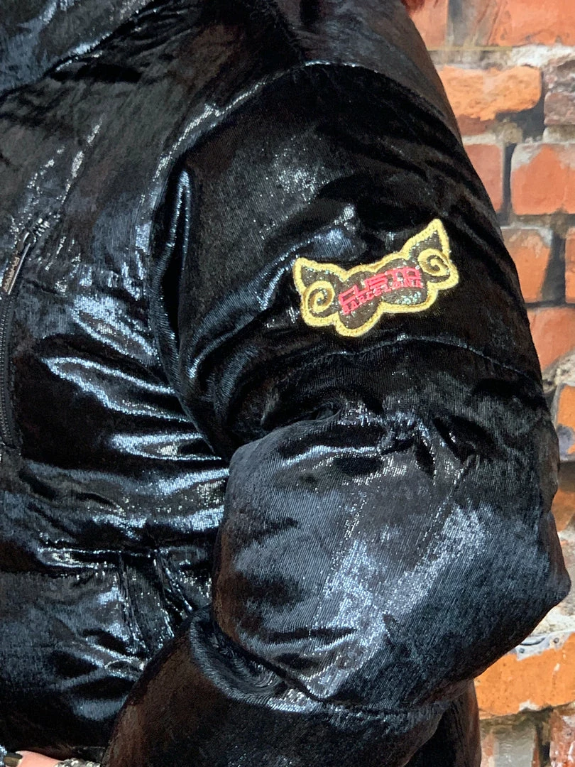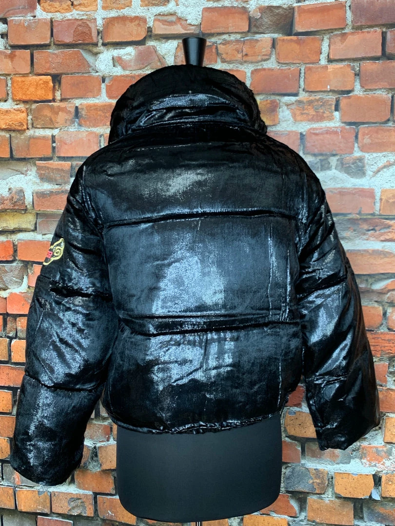 Designed in Spain by Custo Barcelona. Β Black velvet metallic with embroidered logo on sleeve. Β Has drawstrings to make jacket a little more snug to body. Small is generous on me