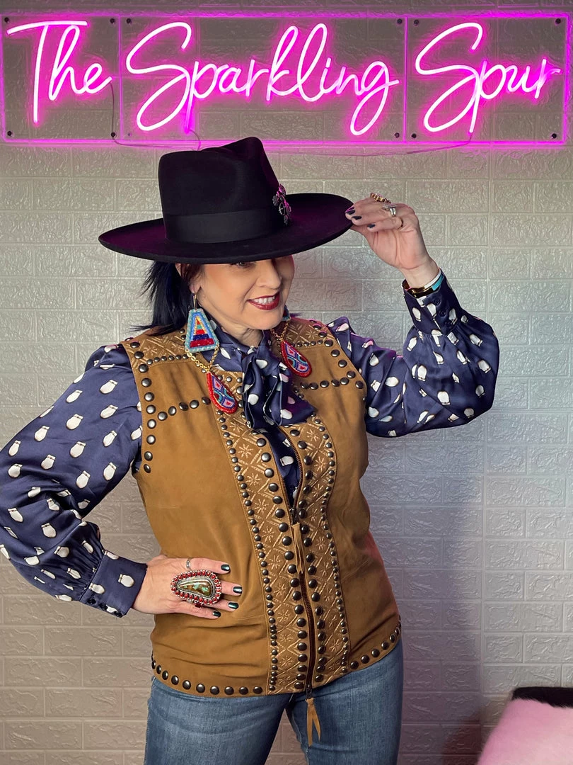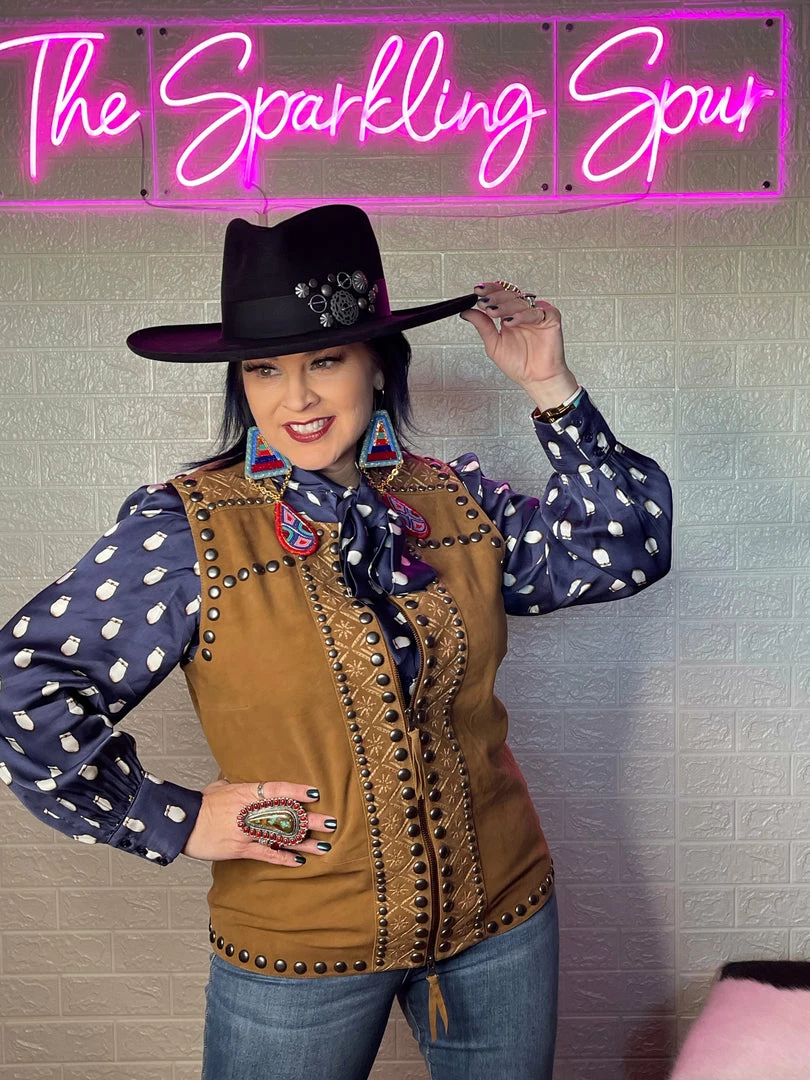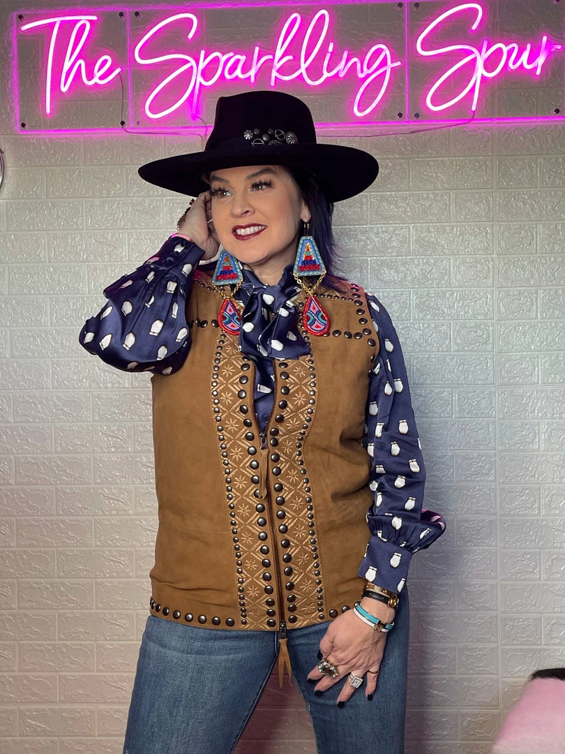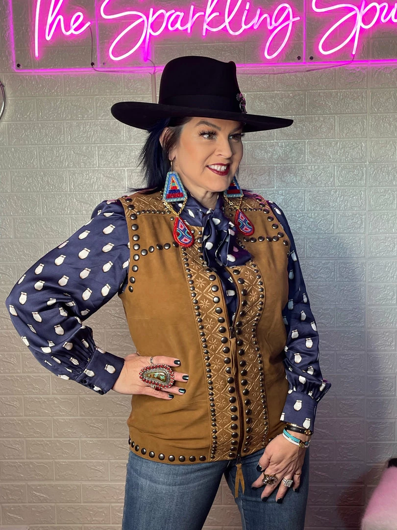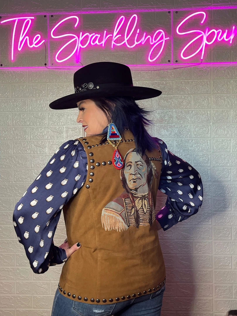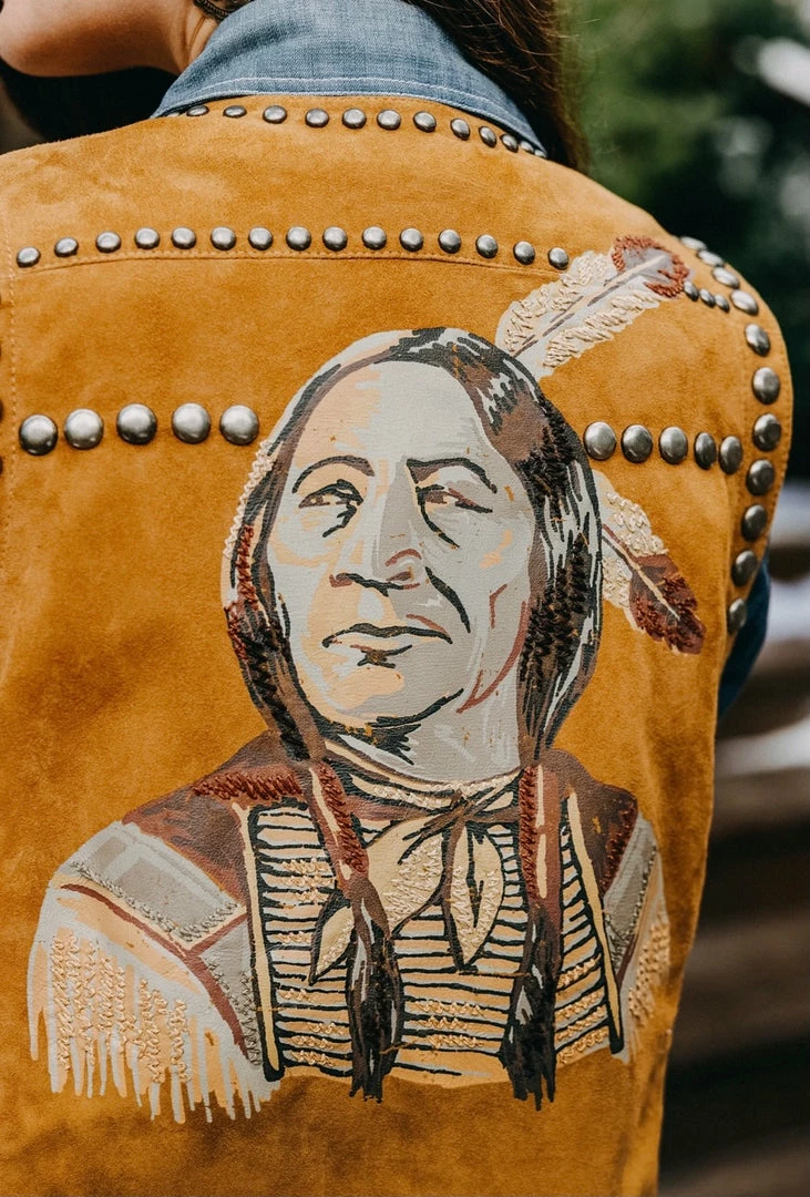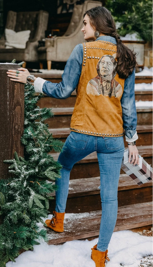 Β We canβt emphasize it enough: a great vest is an absolute game-changer. This supple suede vest balances chic and statement, embellished with a bold image of a warrior and trimmed with strong studwork. Simply stunning and so easy to style.
