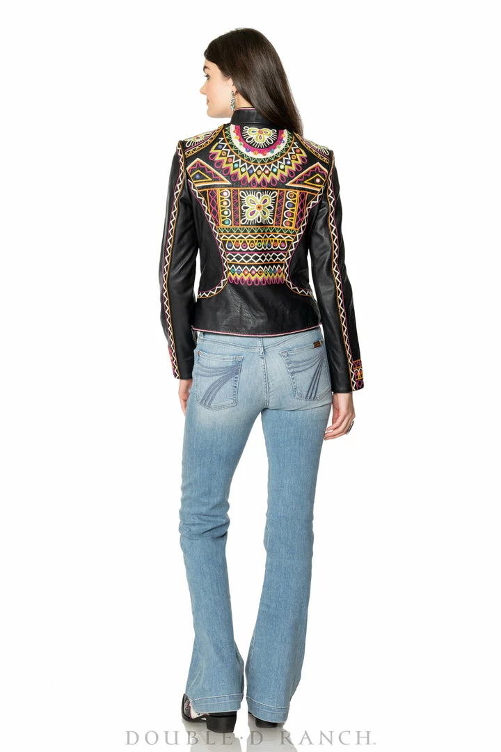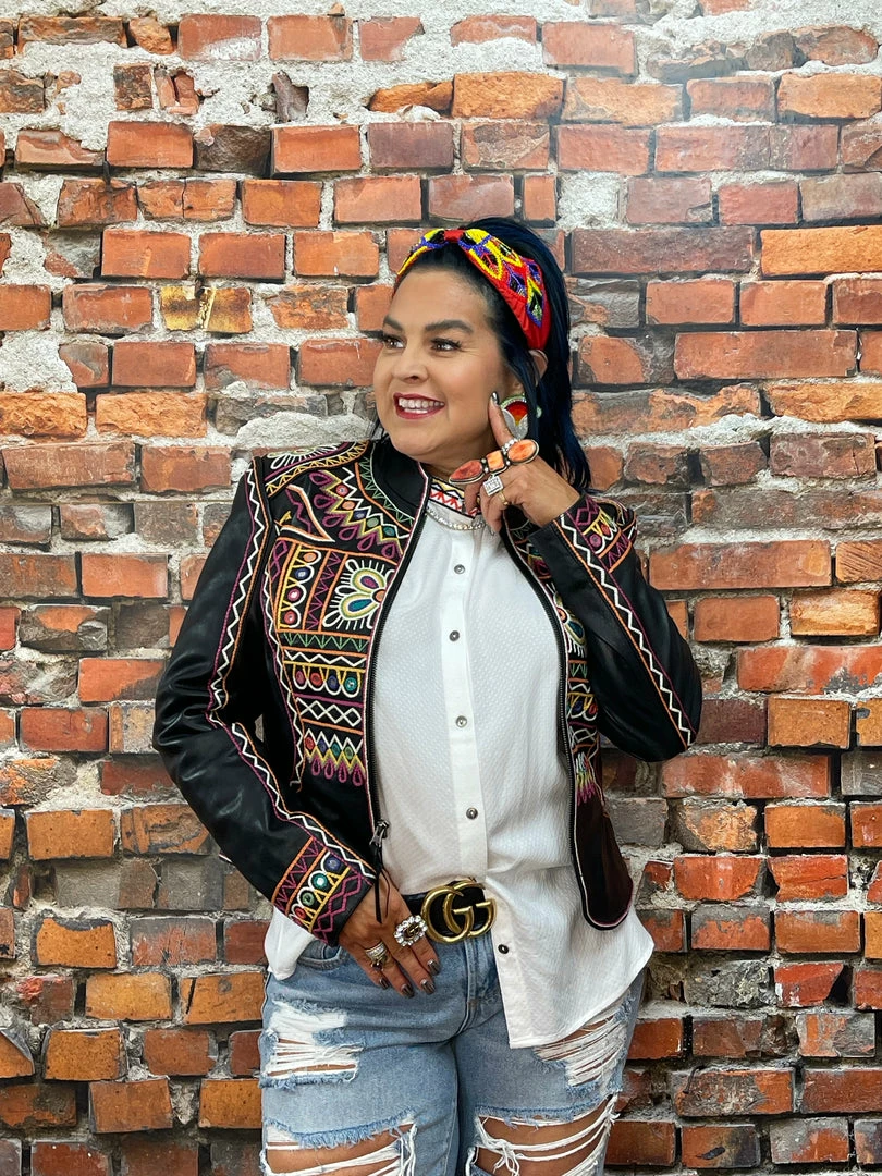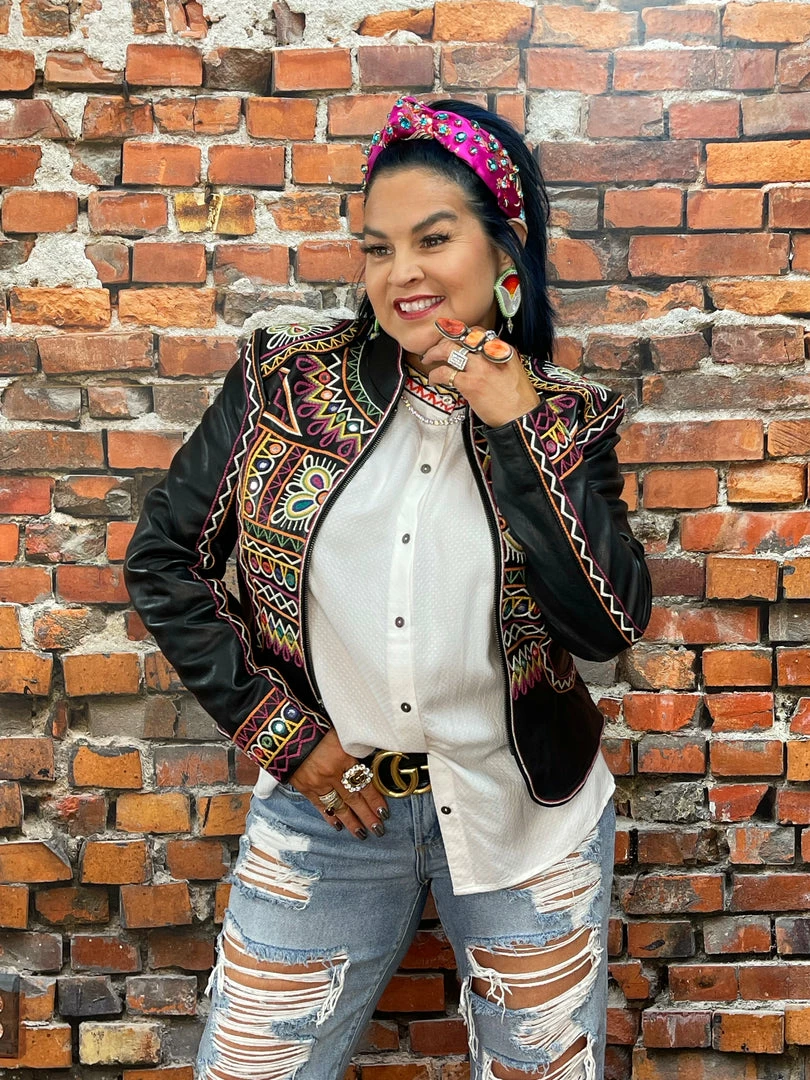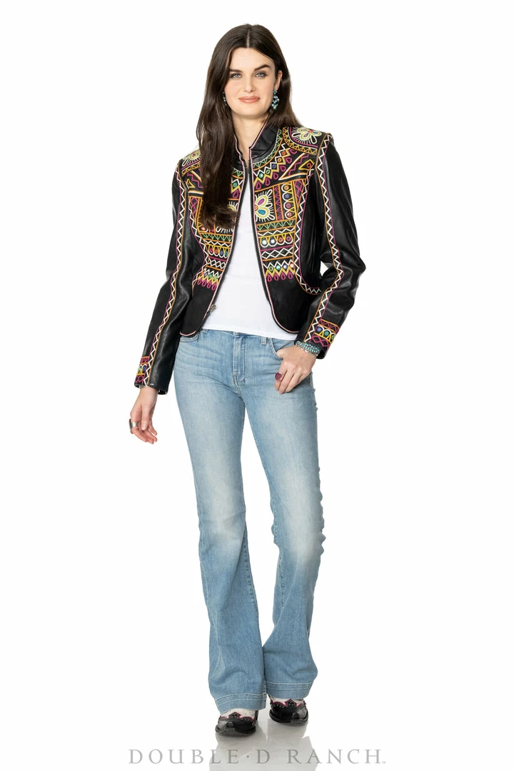 The βFestival of Colorsβ is an enormous and very vibrant annual celebration in India (thatβs actually taking place right about now-ish, March 18th) which involves the tossing, spreading, and smearing of vividly colorful powders, leaving festival-goers covered head-to-toe in lively hues. This jacket incorporates those bright colors as well as intricate geometric embroidery inspired by the folk art aesthetic from that part of the world. You canβt NOT feel joyous in this jacket β itβs like wearing a party!