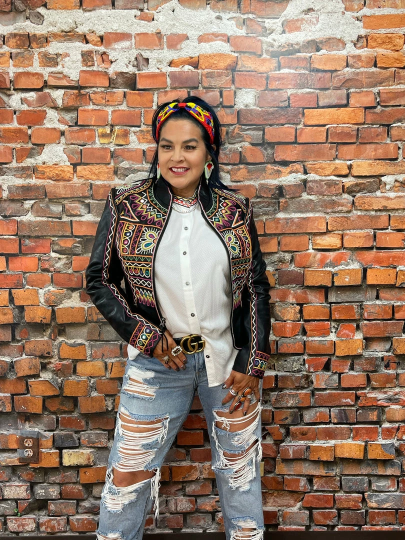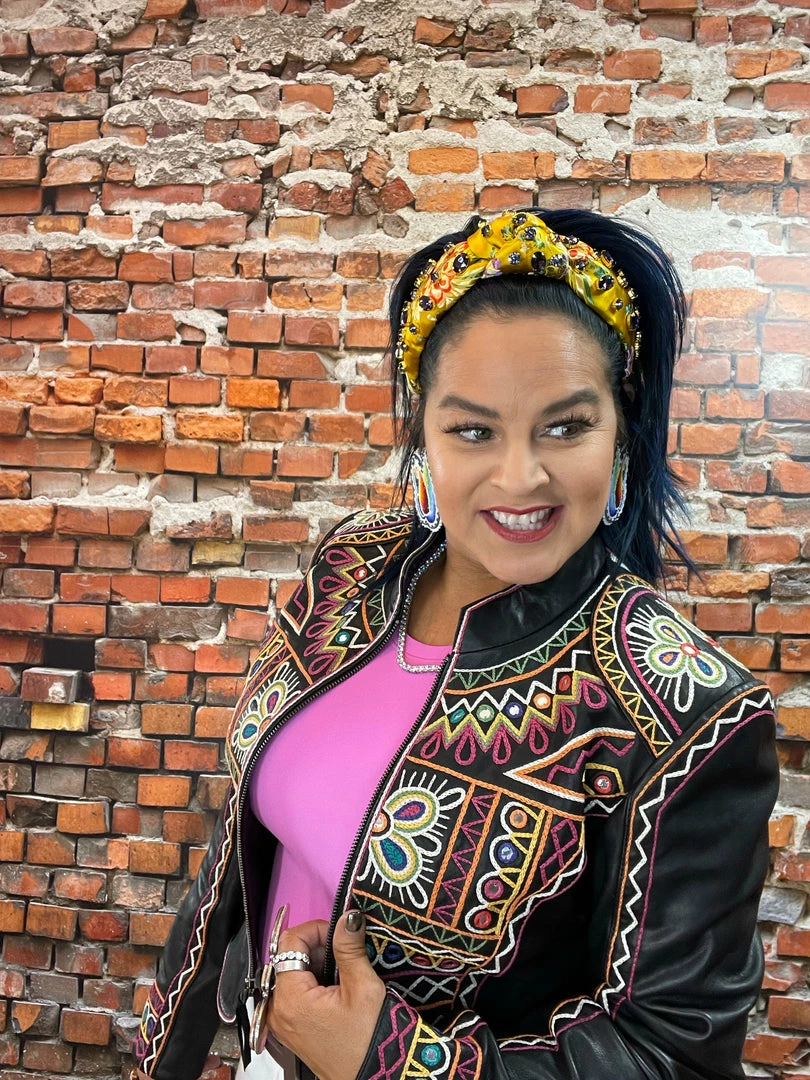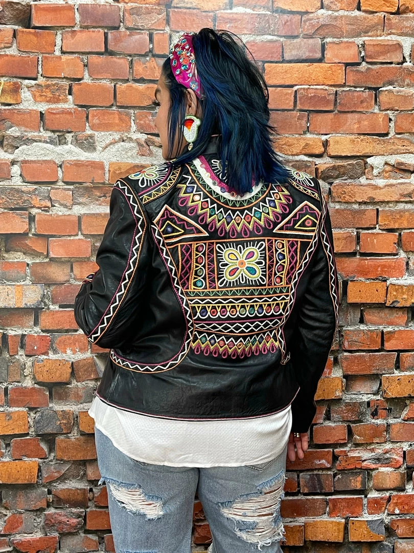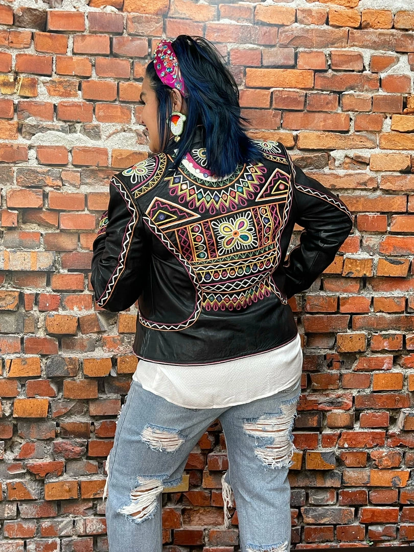 The βFestival of Colorsβ is an enormous and very vibrant annual celebration in India (thatβs actually taking place right about now-ish, March 18th) which involves the tossing, spreading, and smearing of vividly colorful powders, leaving festival-goers covered head-to-toe in lively hues. This jacket incorporates those bright colors as well as intricate geometric embroidery inspired by the folk art aesthetic from that part of the world. You canβt NOT feel joyous in this jacket β itβs like wearing a party!