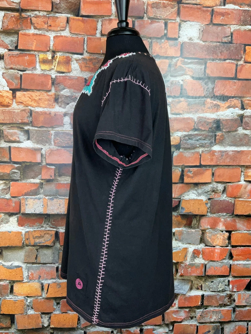 Beadwork and embroidery surround the neckline of this comfortable long top that is sure to become a favorite.