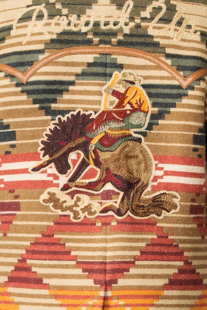 A throwback to the thing that first got us started, this Yellowstone Camp Blanket Jacket is made in the collectionβs custom serape print designed exclusively for DDR, incorporating all the sunset and outdoor shades that inspired the Yellowstone collection. Itβs a classic silhouette that hits at the hip with a peak lapel and a faux-leather collar, and it has awesome hand-embroidery on the back of a buckinβ bronc and βRound Upβ in script. Absolutely fabulous fall jacket, the kind of head-turner that will have strangers begging to know where you got it.
