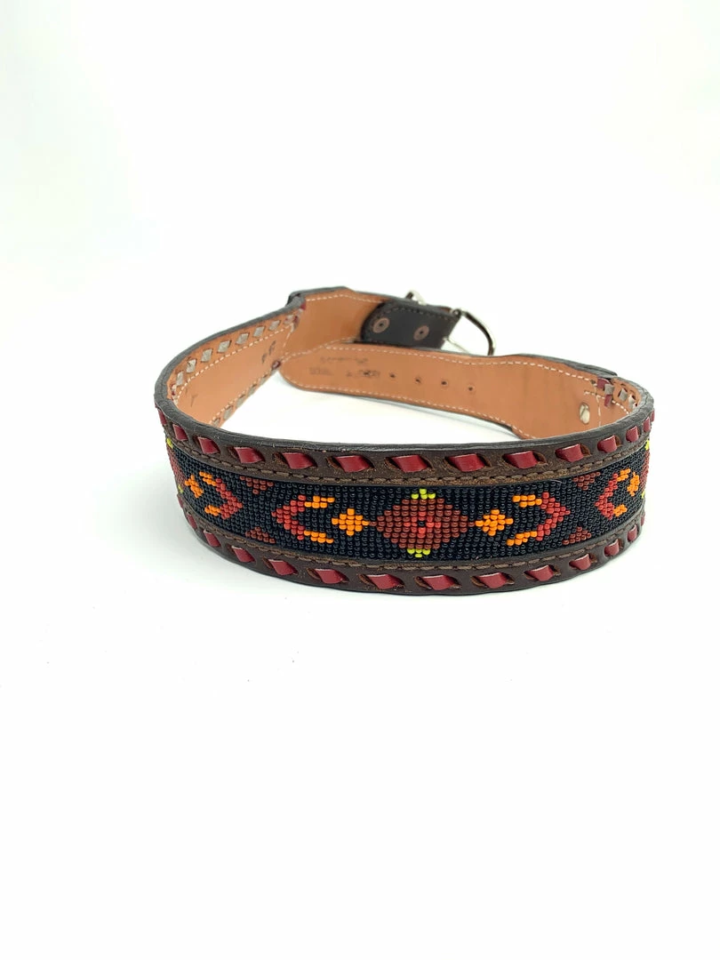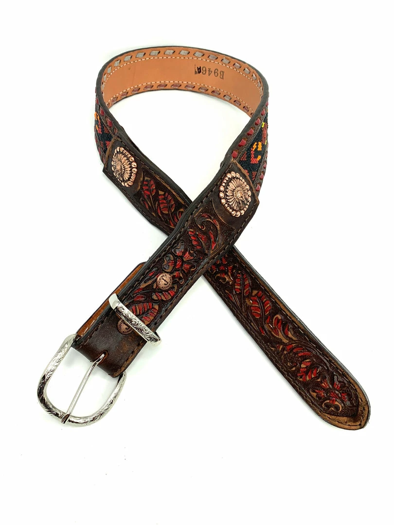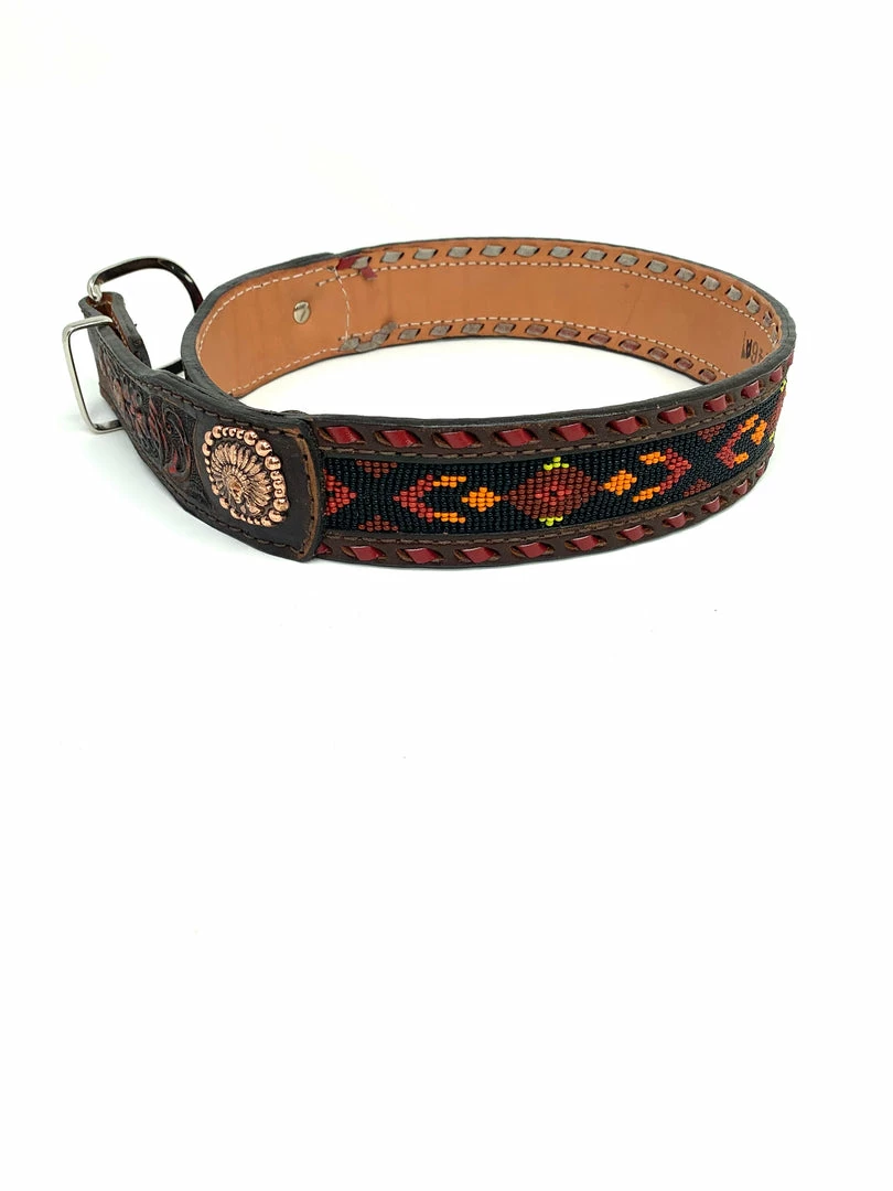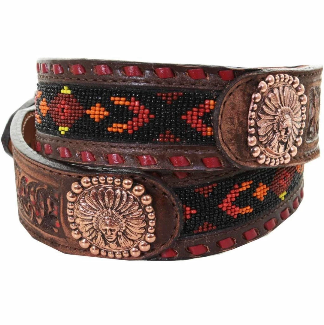 Vintage belt with floral tooled and highlighted ends.Β Sunset beaded inlay, red buck stitch and antique copper indian head conchos.