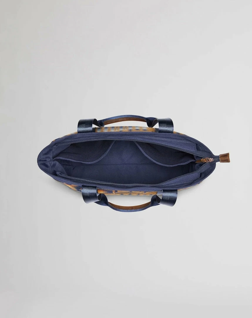 A versatile tote bag crafted from our woven-in-USA wool jacquard, with a sturdy polyester canvas base and leather-trimmed dual handles. Zip closure, interior slip pockets and antiqued copper hardware. Lined. Pattern placement may vary.