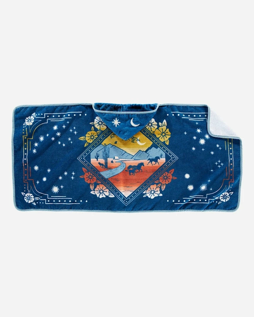 Dry off and cuddle wee ones with a cozy hooded kidsโ towel in soft, thick cotton. Woven in a design of a desert at night, with a stallion, mare and colt galloping fast and free under the starry sky.