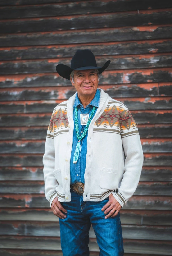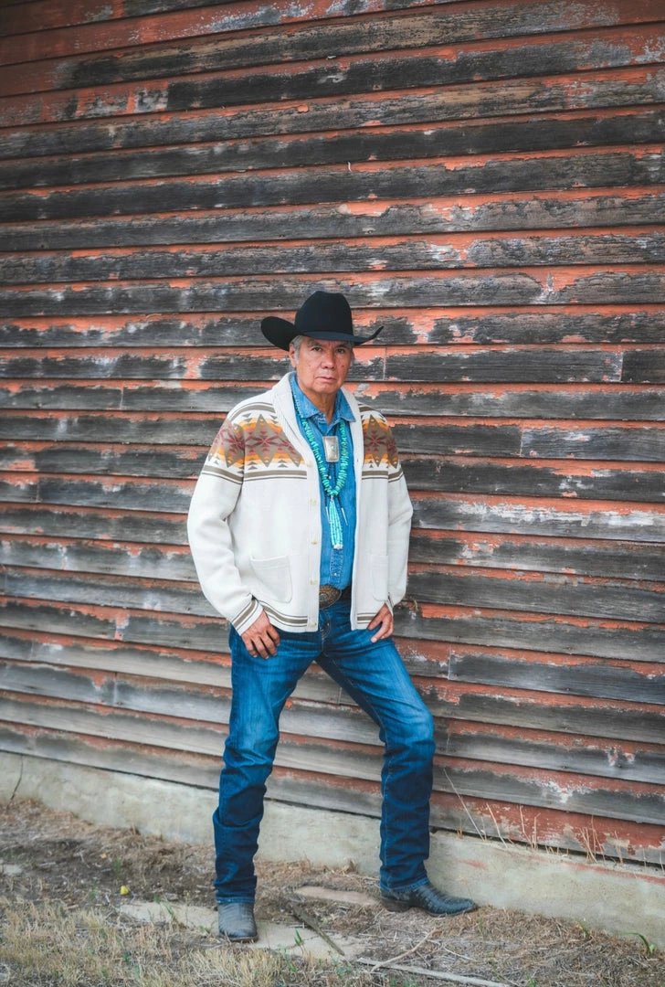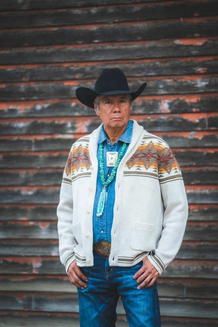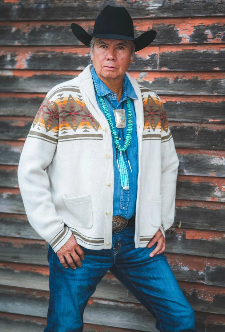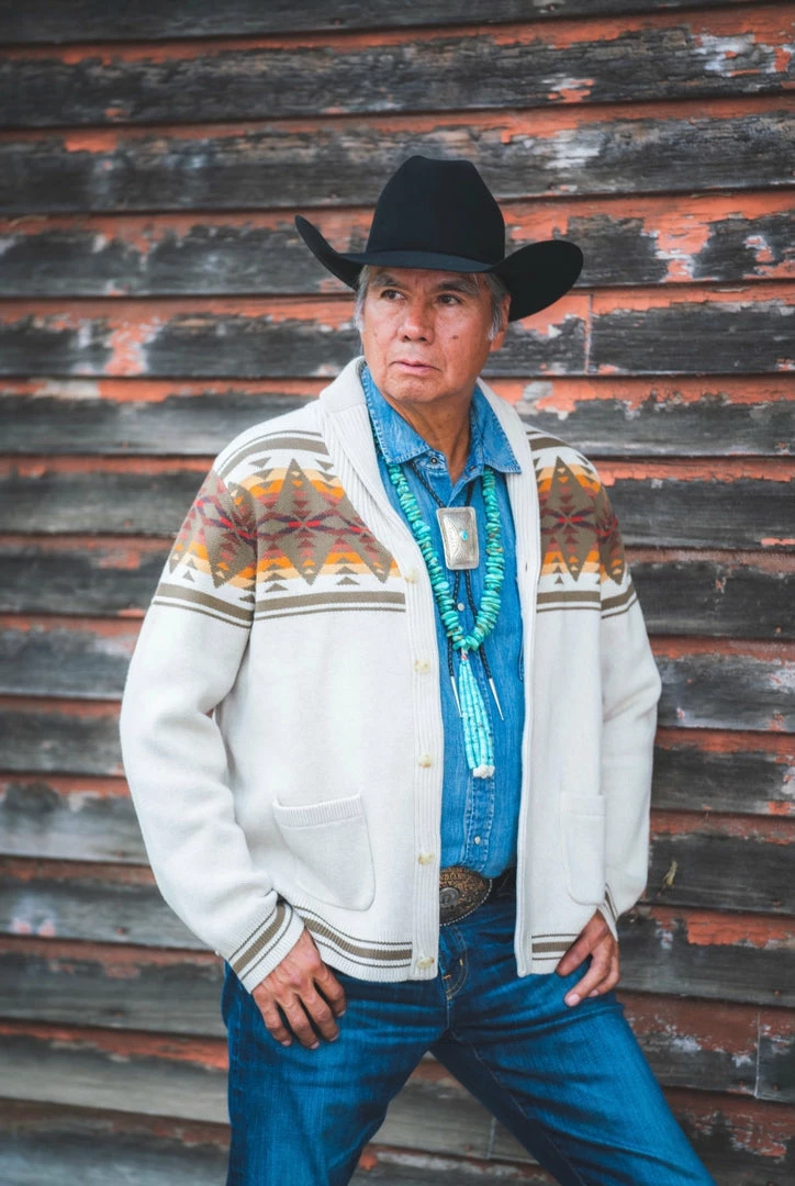 Button-front men’s cardigan knit of pure cotton, with a uniquely Pendleton pattern front and back. Two front pockets; ribbed shawl collar, cuffs and hem.