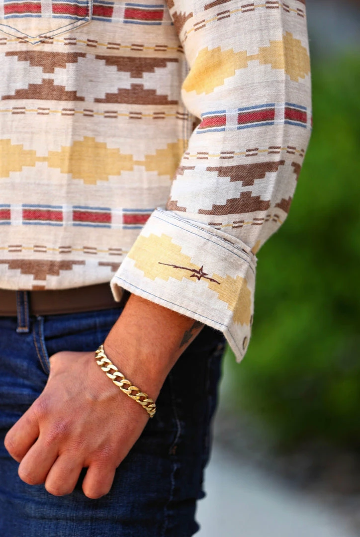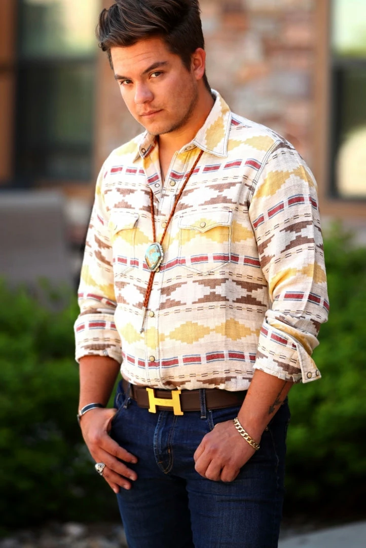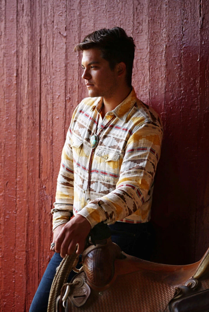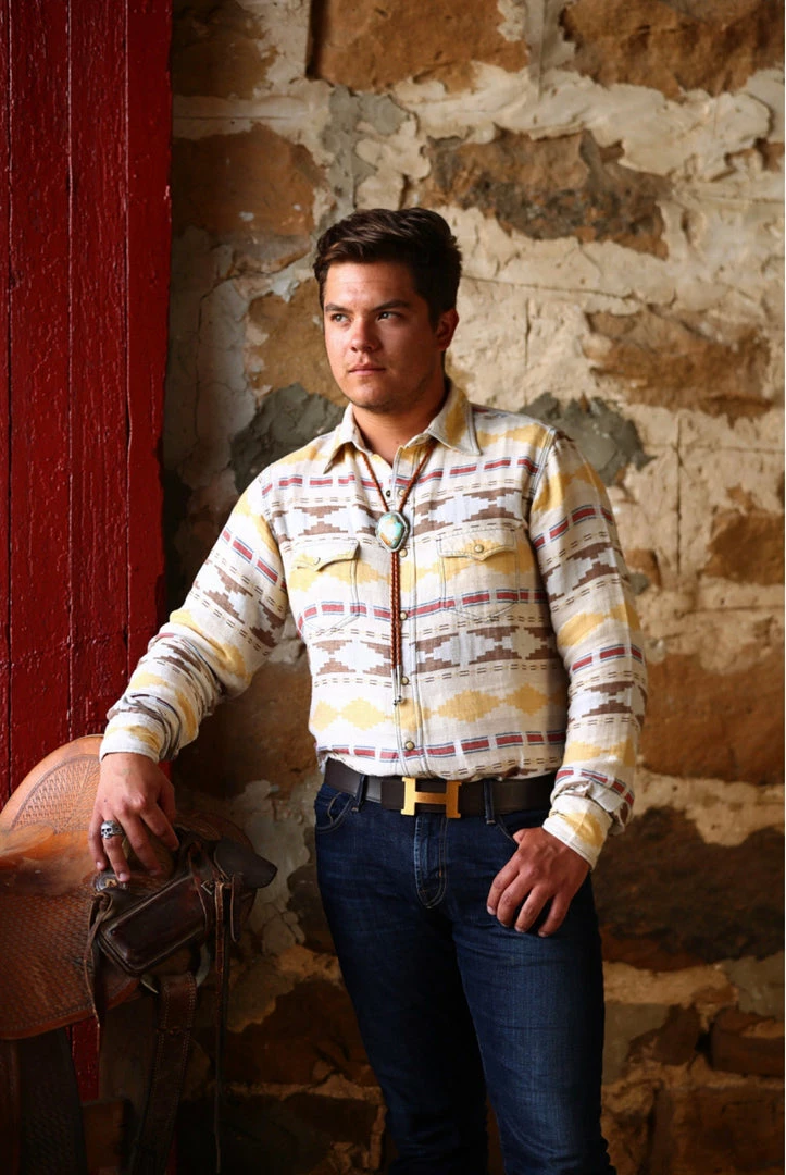 Brushed cotton, blanket jacquard shirt has a soft flannel feel to it making it perfect for cooler weather. Β Accented with contrast stitching and finished with horn snaps.