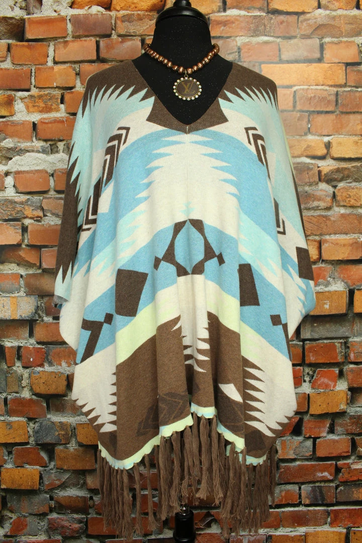 Contrasting colors of the natural elements of earth and water give this poncho a relaxing effect.