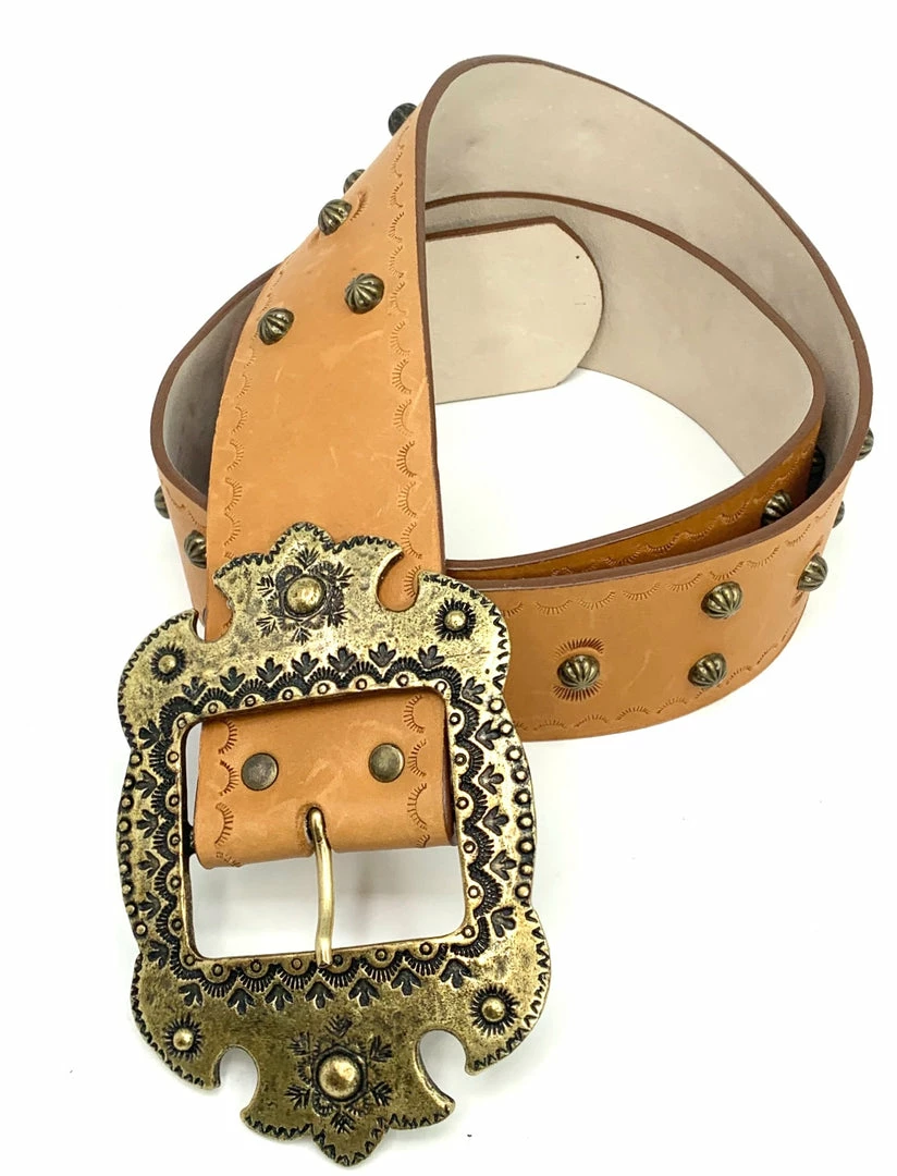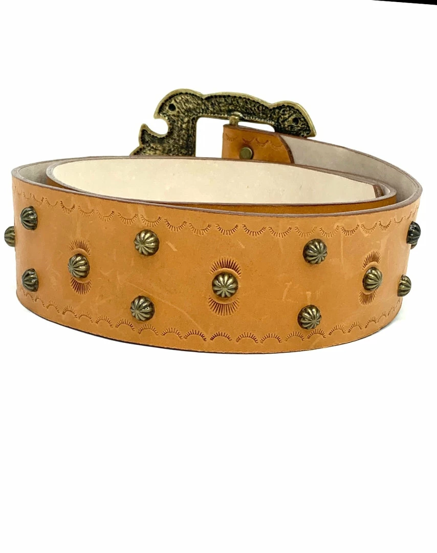 Simple and functional.Β This belt is adorned with metal accents and a stamped design along both edges.Β Β