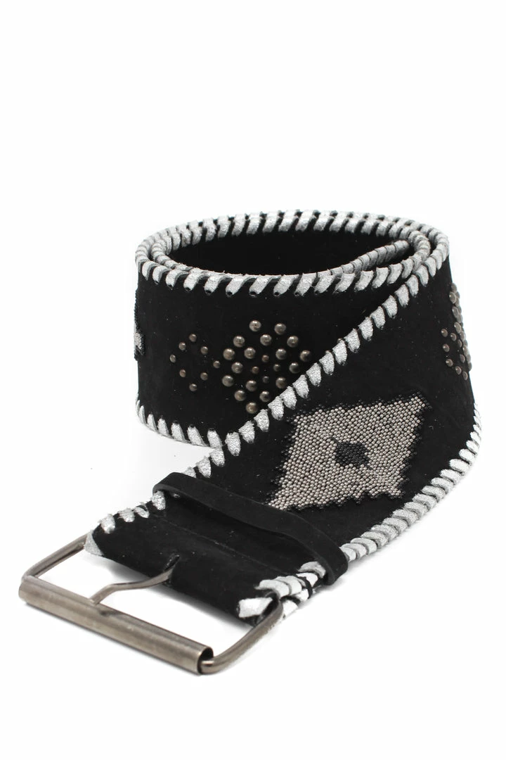 Black leather belt with silver beads, studs, fringed end and silver stitching on the edges.
