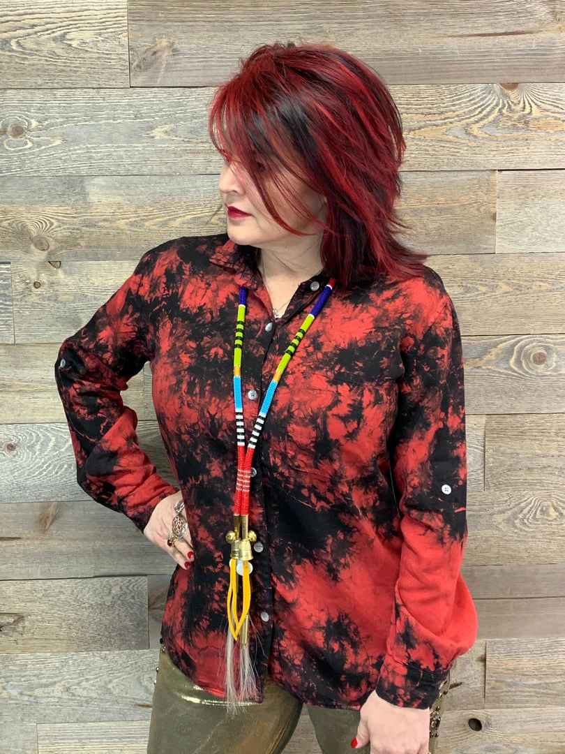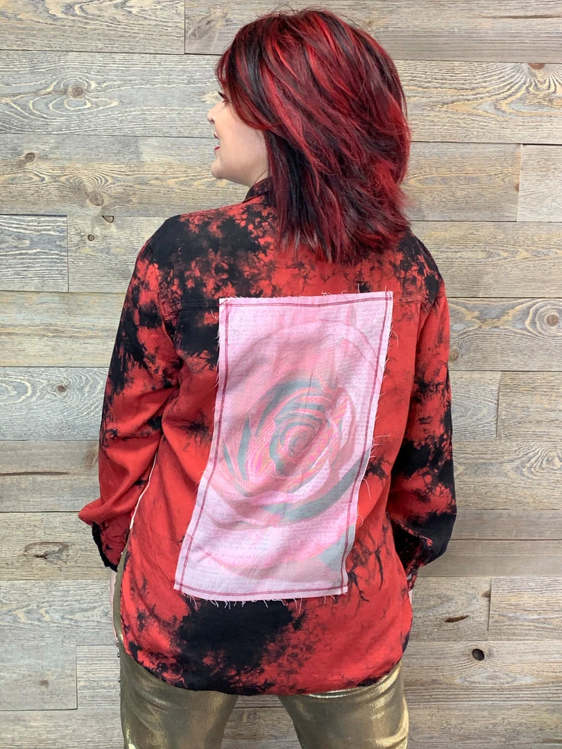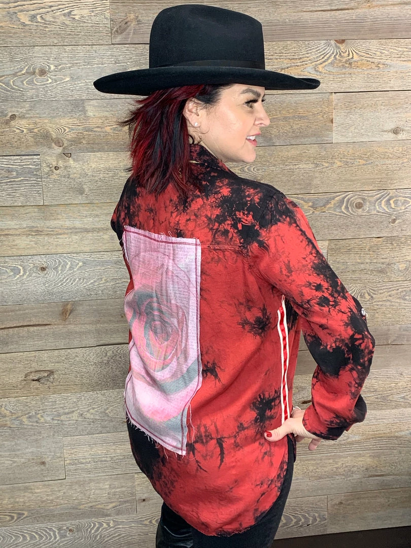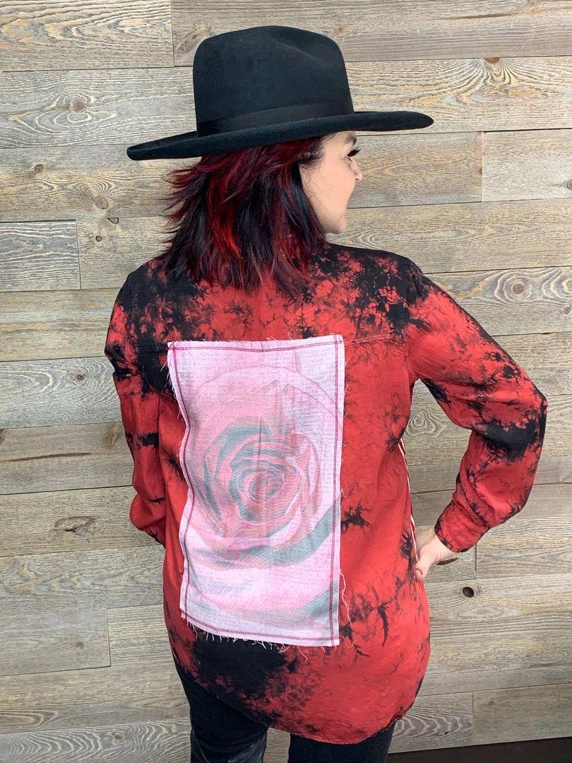 The Valentine is so pretty!! Β It is a button down red & black shirt made of 100% Rayon. It has a stripe down the sides and a fabric rose design on the bοΏΌοΏΌack. Roll up and button sleeves optional.Β