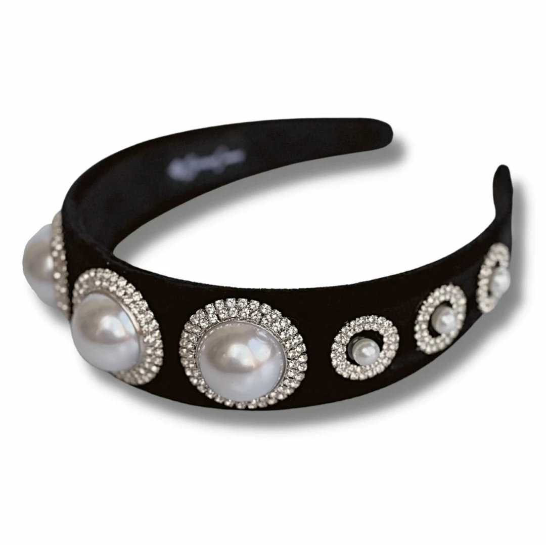 - Black velvet headband with jumbo resin pearls and rhinestone detailΒ