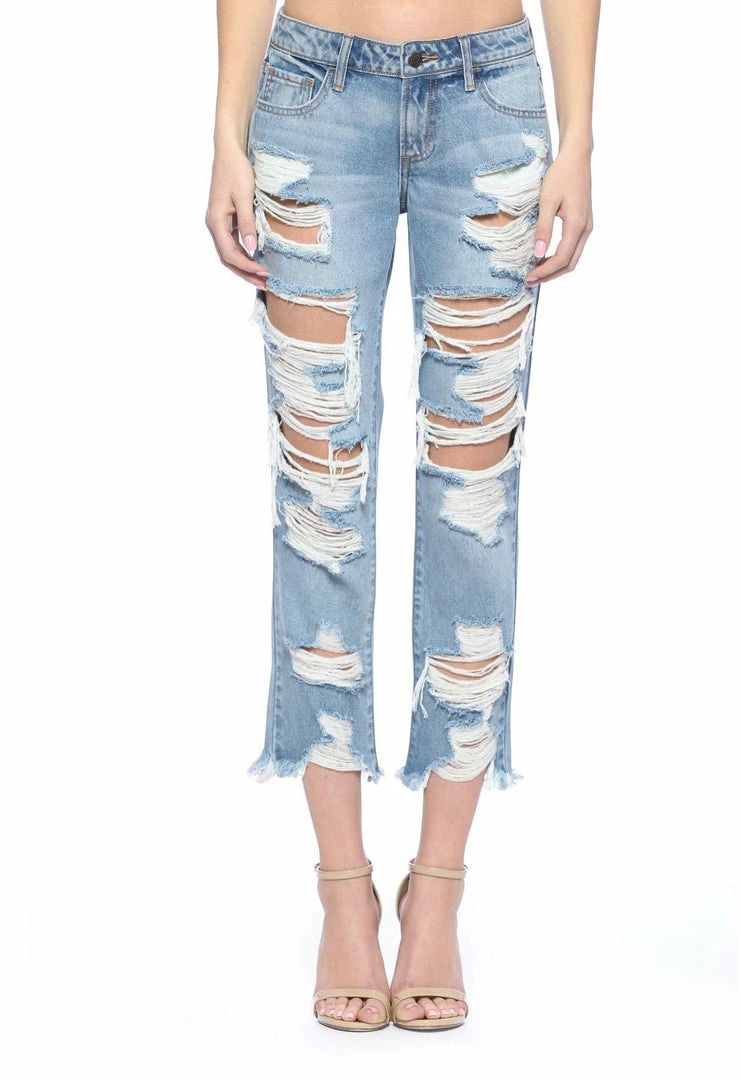 Beautifully balanced, these boyfriend jeans offer a comfy mid rise and slouchy fit. Their destructed detailing and light blue wash make them a must have.Β