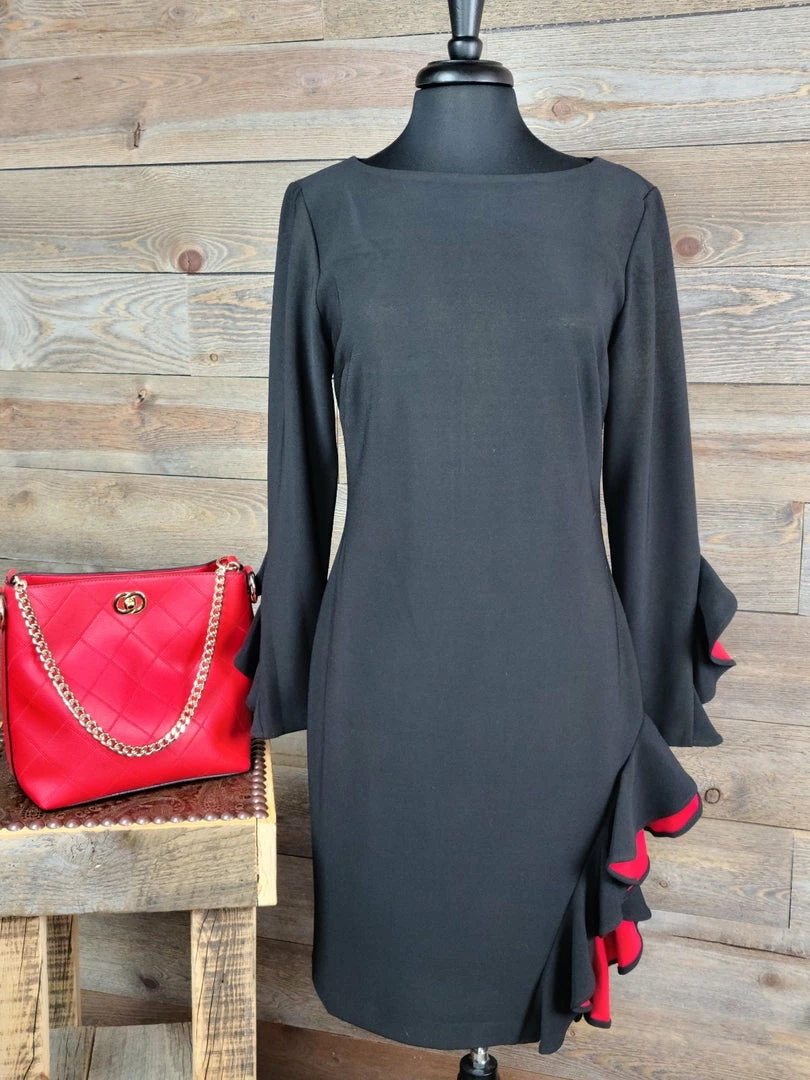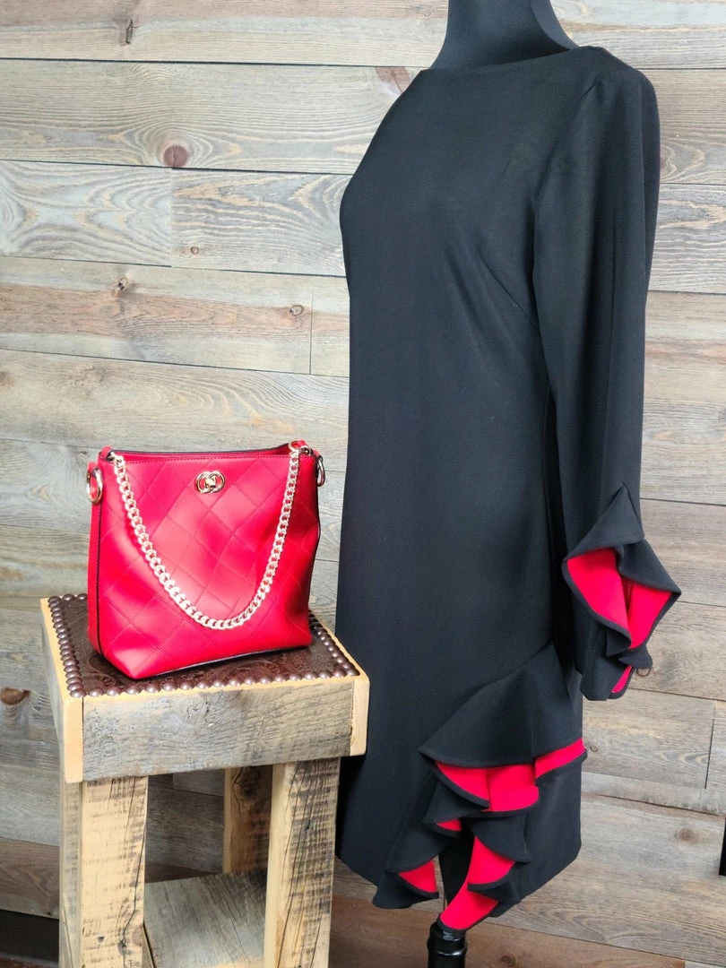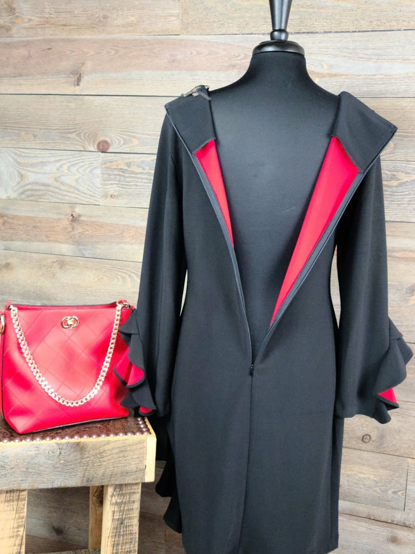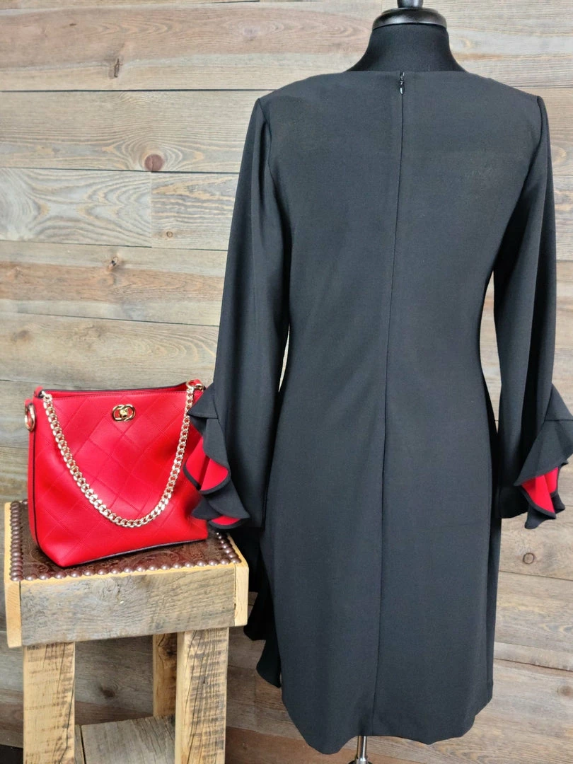 Simple with a flair!Β Black dress with red lining that is also exposed in the ruffles on the dress and sleeves.
