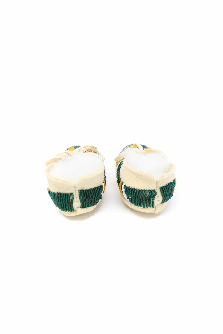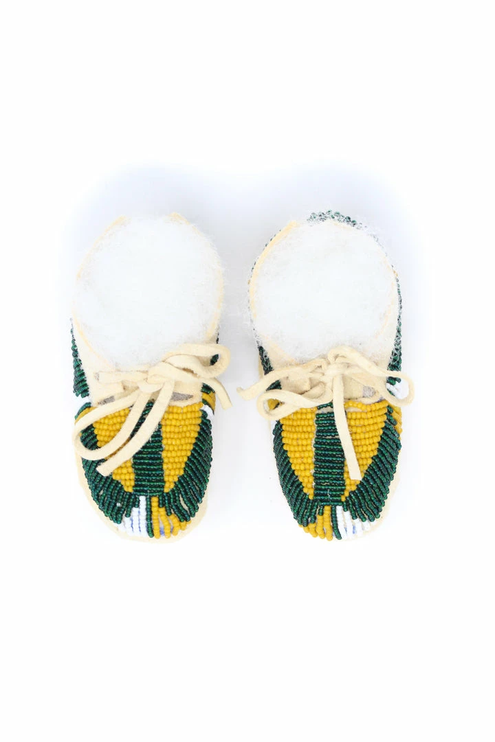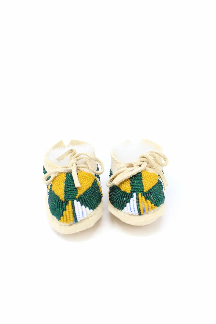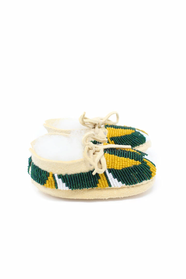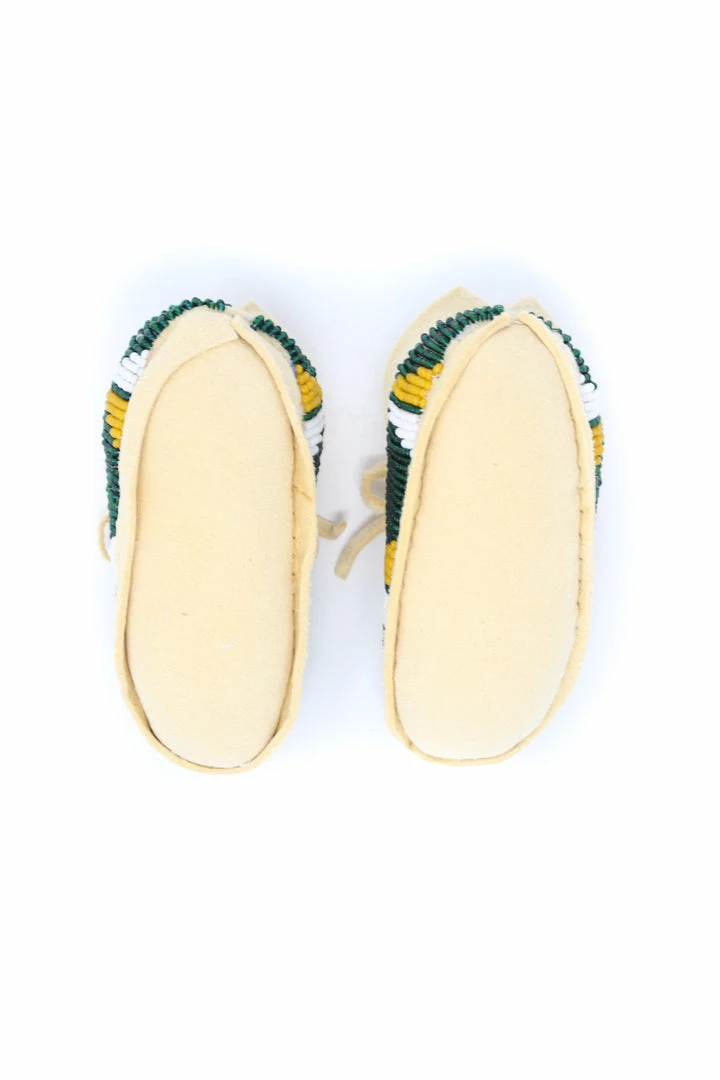 Tanned hide baby moccasins adorned with size 11/0Β vintage seedΒ beads.Β