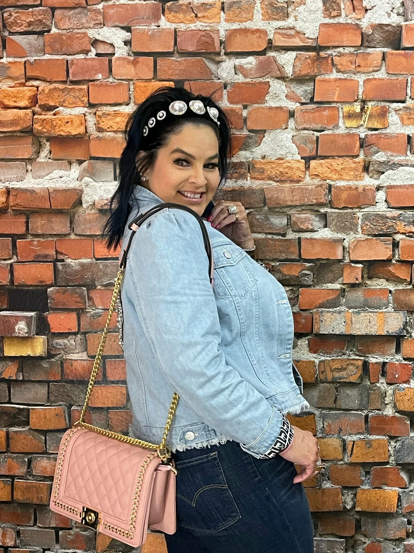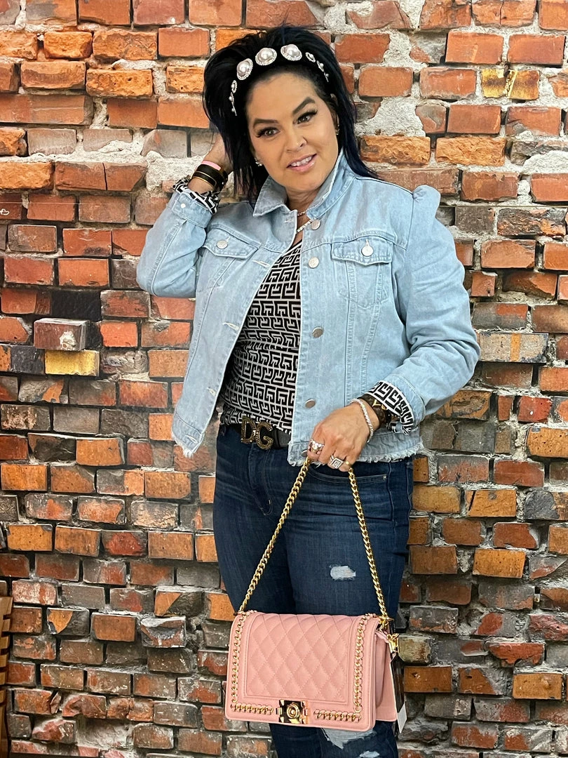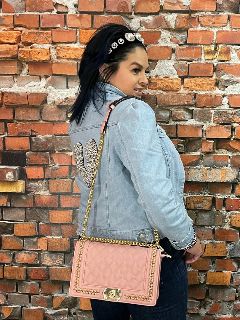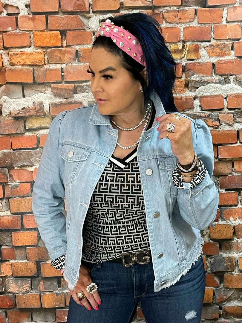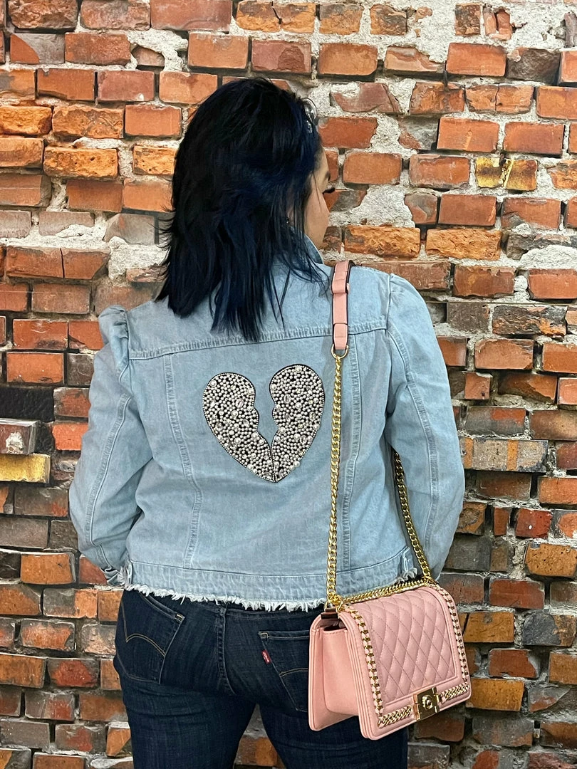 Light Blue Denim Jacket raw edge hem embellished jewel + Pearl broken heart. Β With an all over designer inspired lining in jacket.