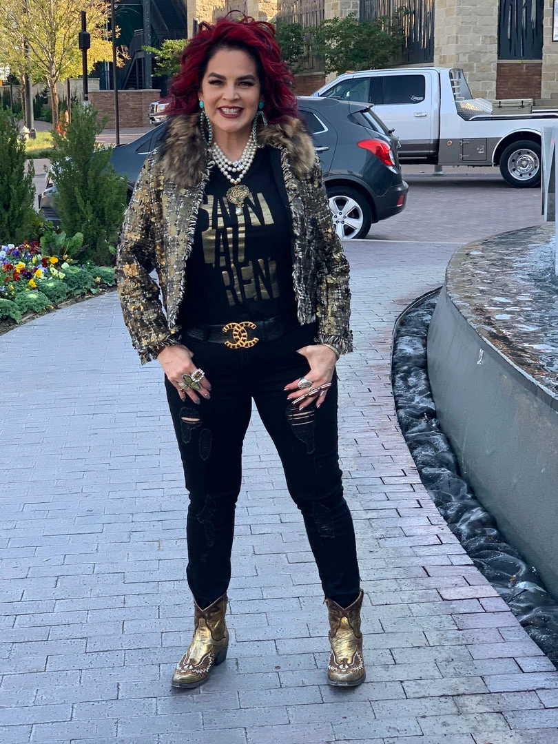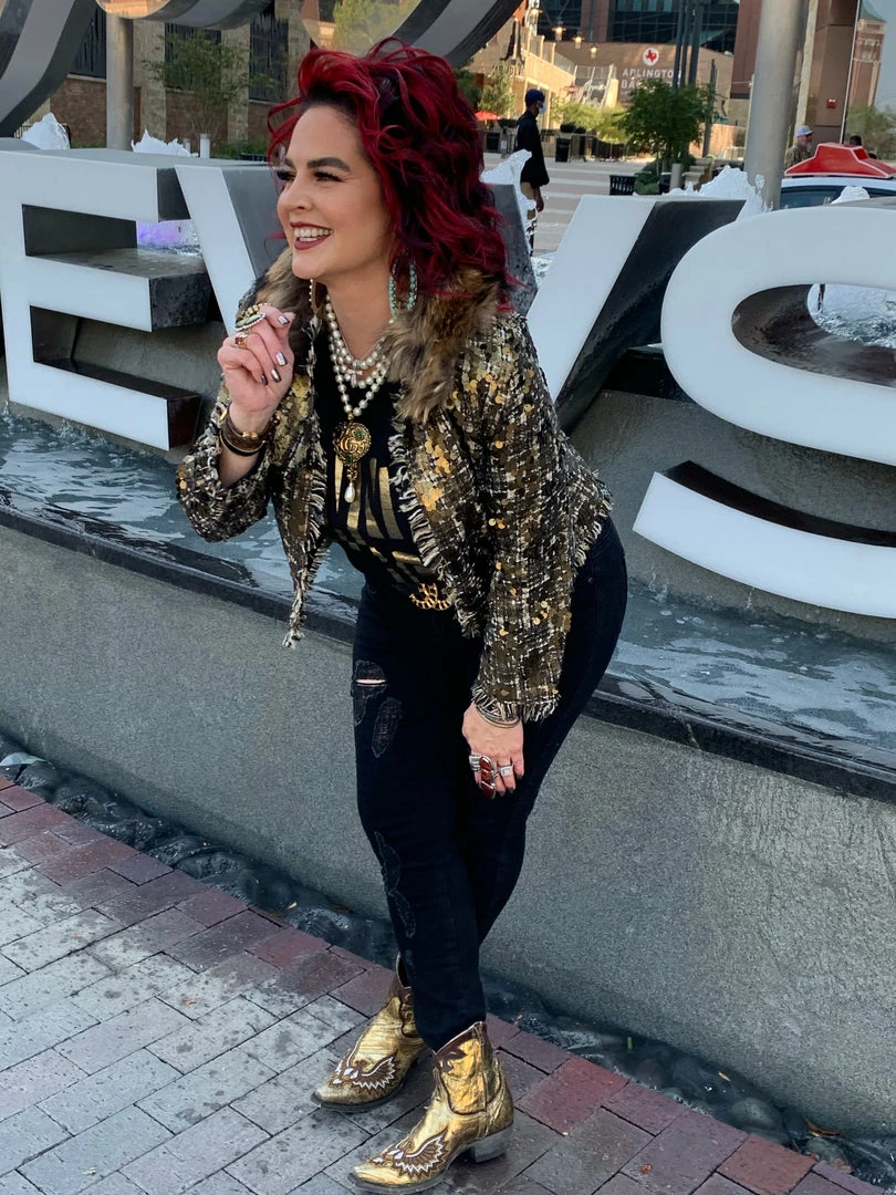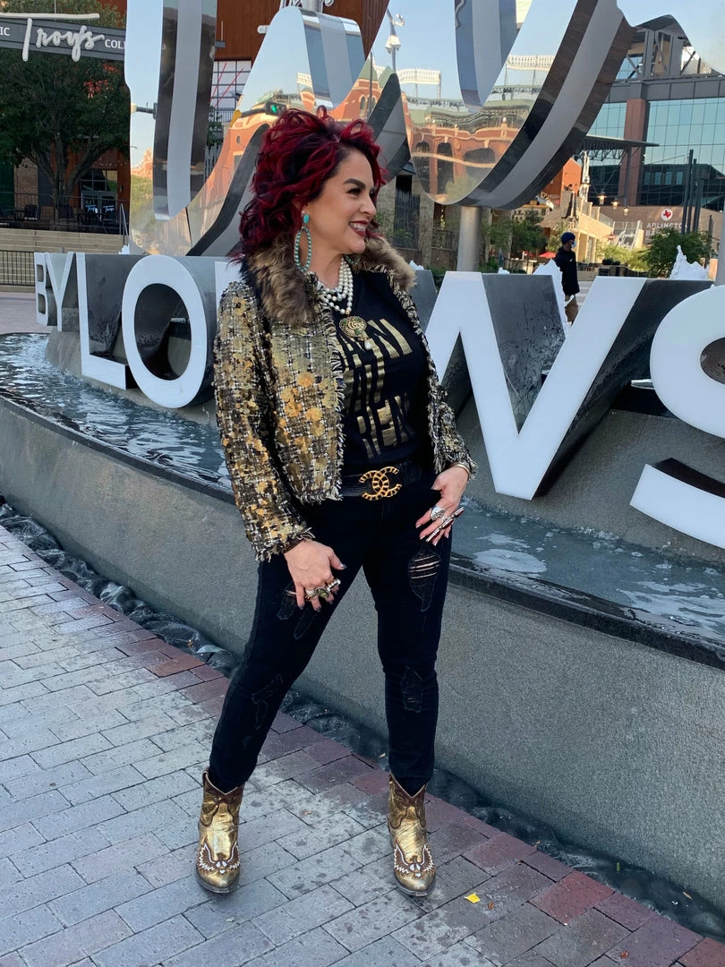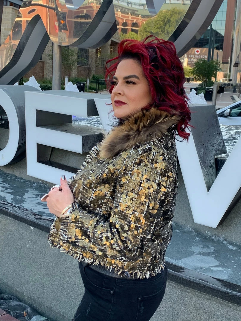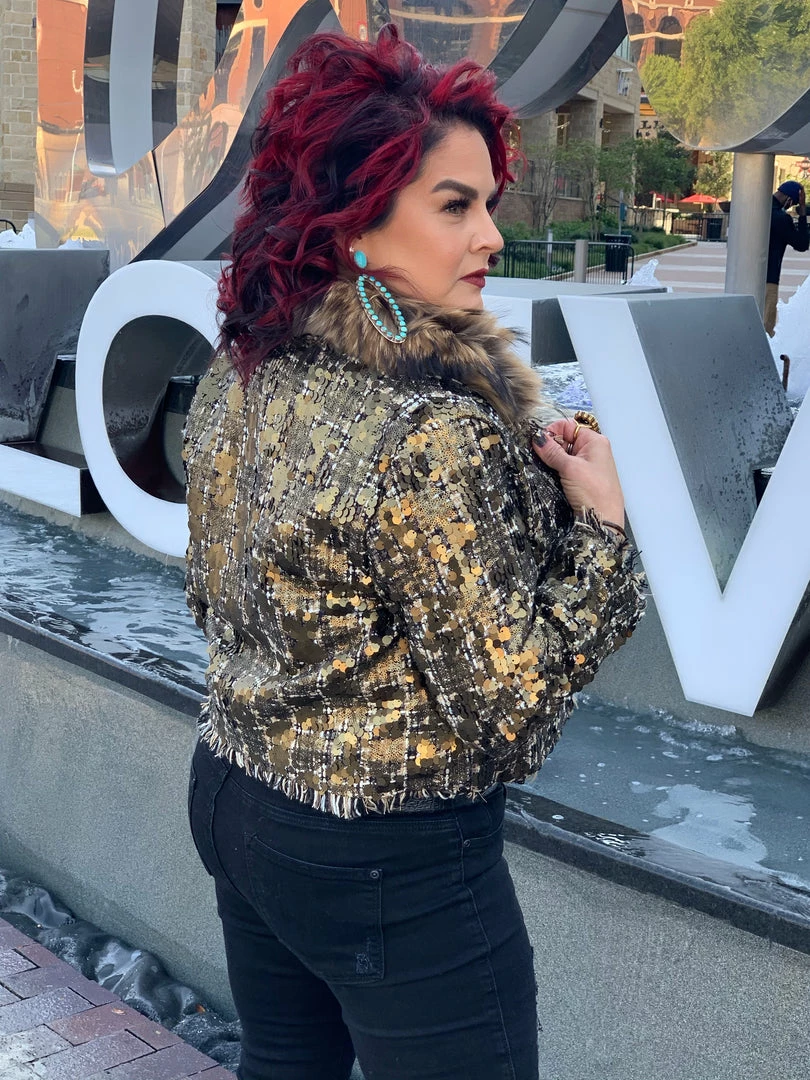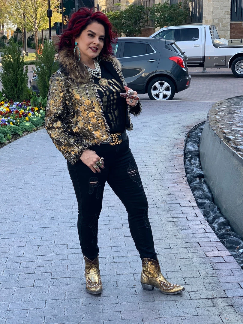 Sometimes all it takes is to put everything together like with this cropped, tweedΒ & sequin jacket with a gold fur collar, and you have a winner!