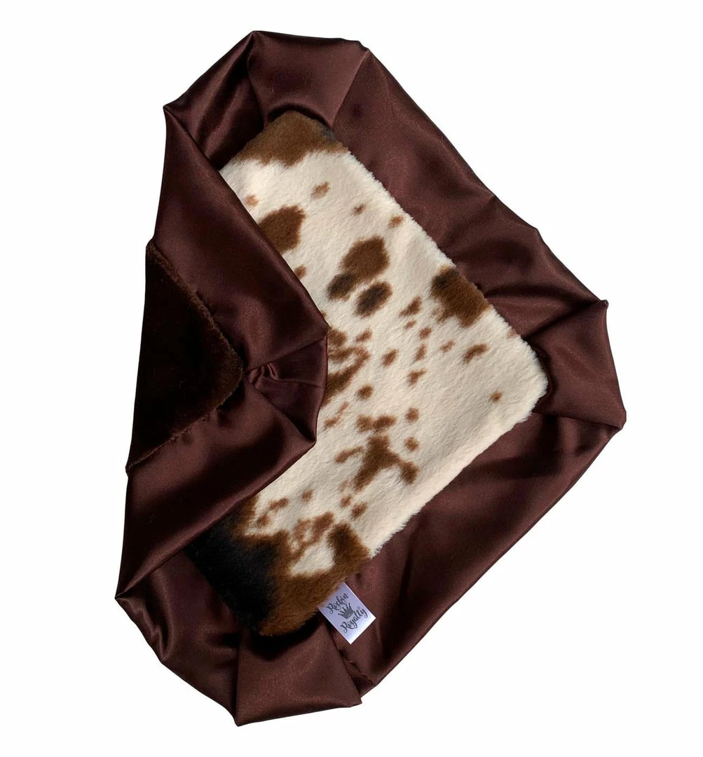 This cuddle lovie includes a soft Cow print and is backed with soft faux fur. It is trimmed with a generous satin ruffle that the babies love to snuggle with! Approximately 15″ X 15″