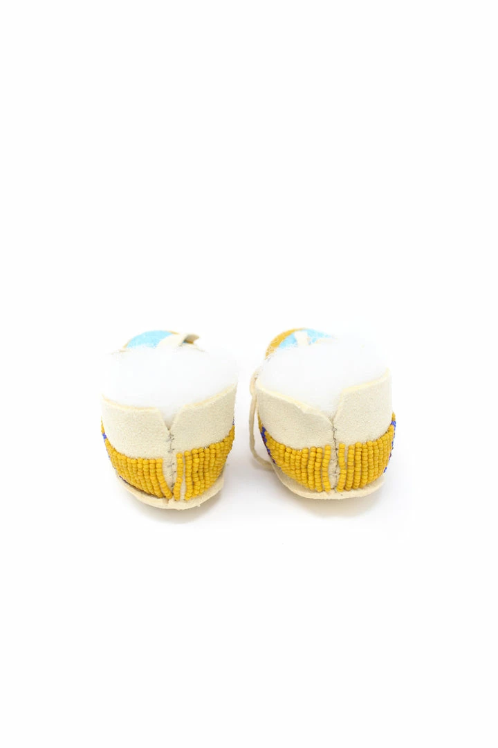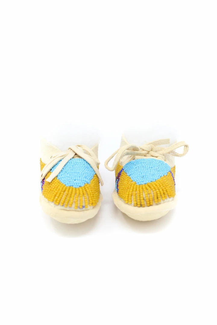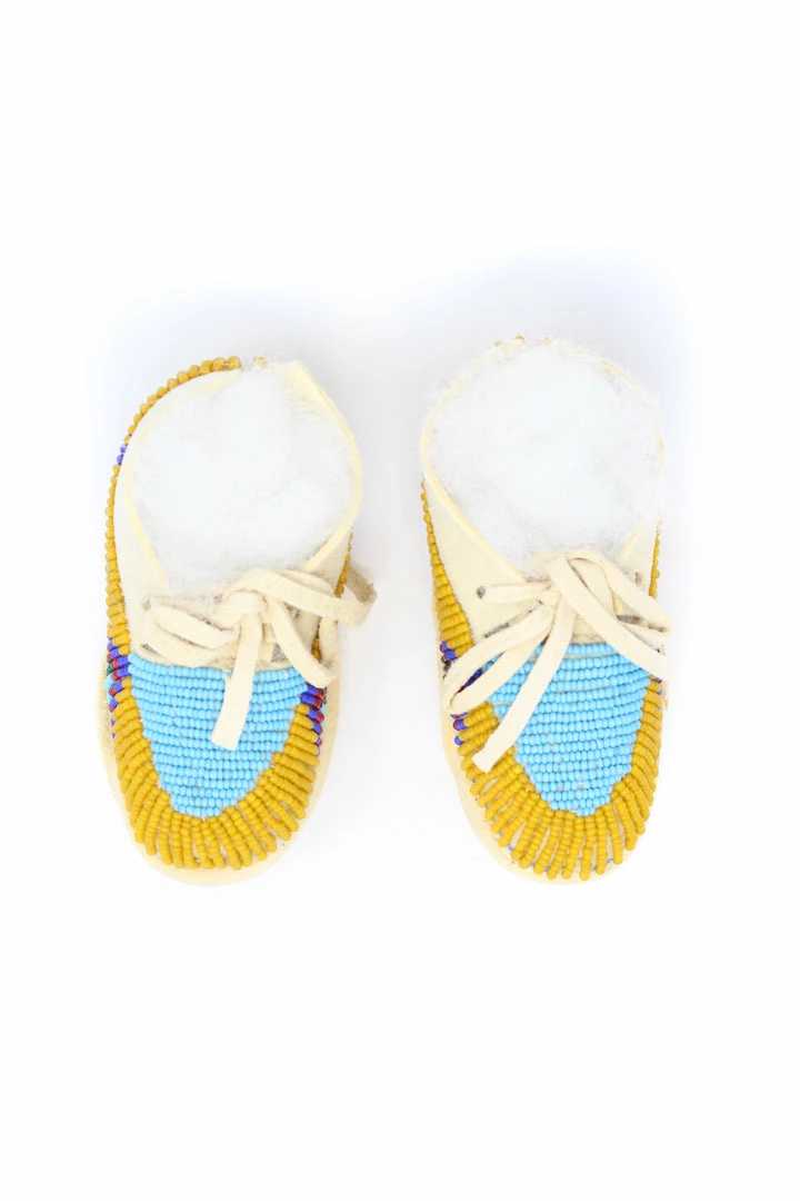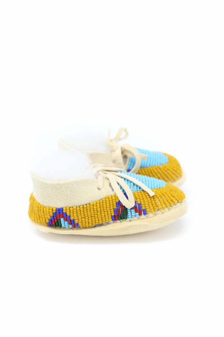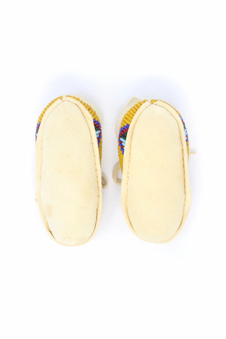 Tanned hide baby moccasins adorned with size 11/0Β vintage seedΒ beads.Β
