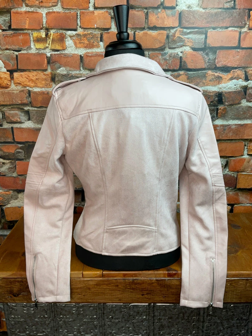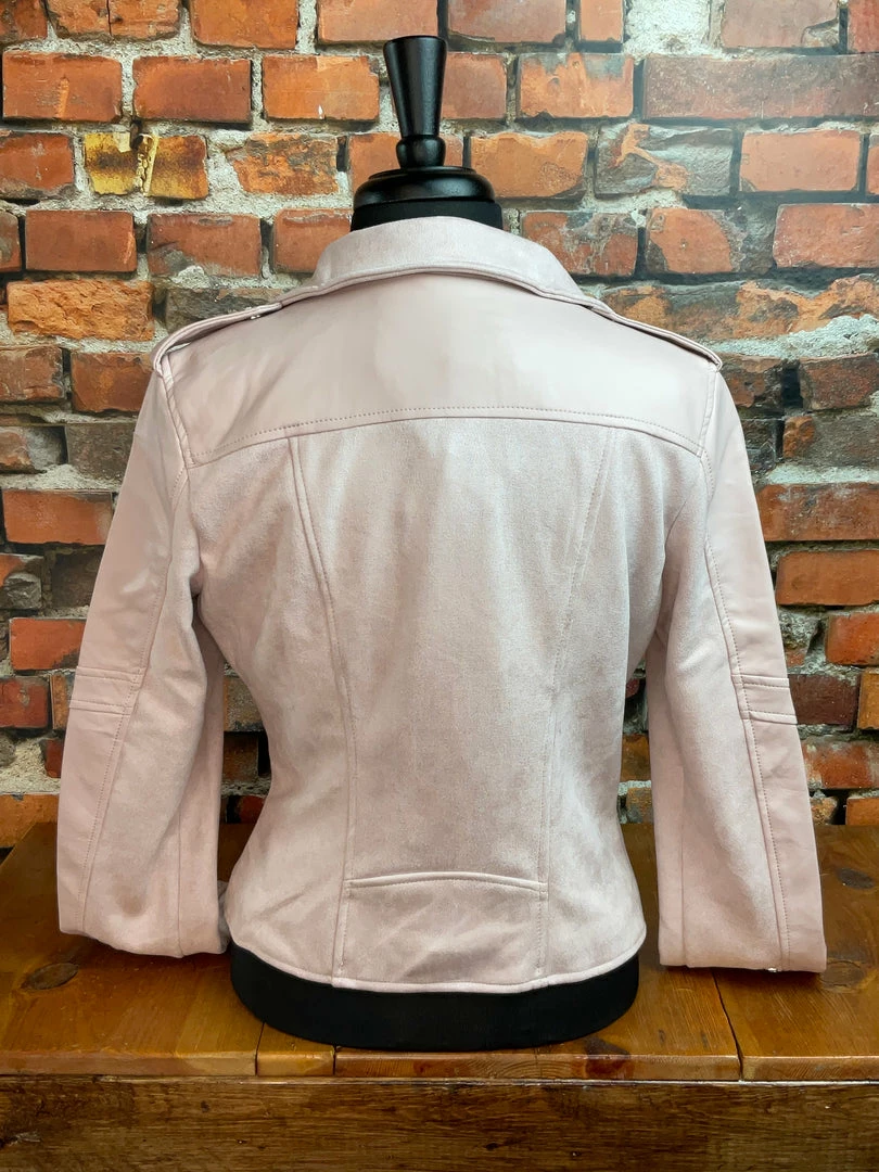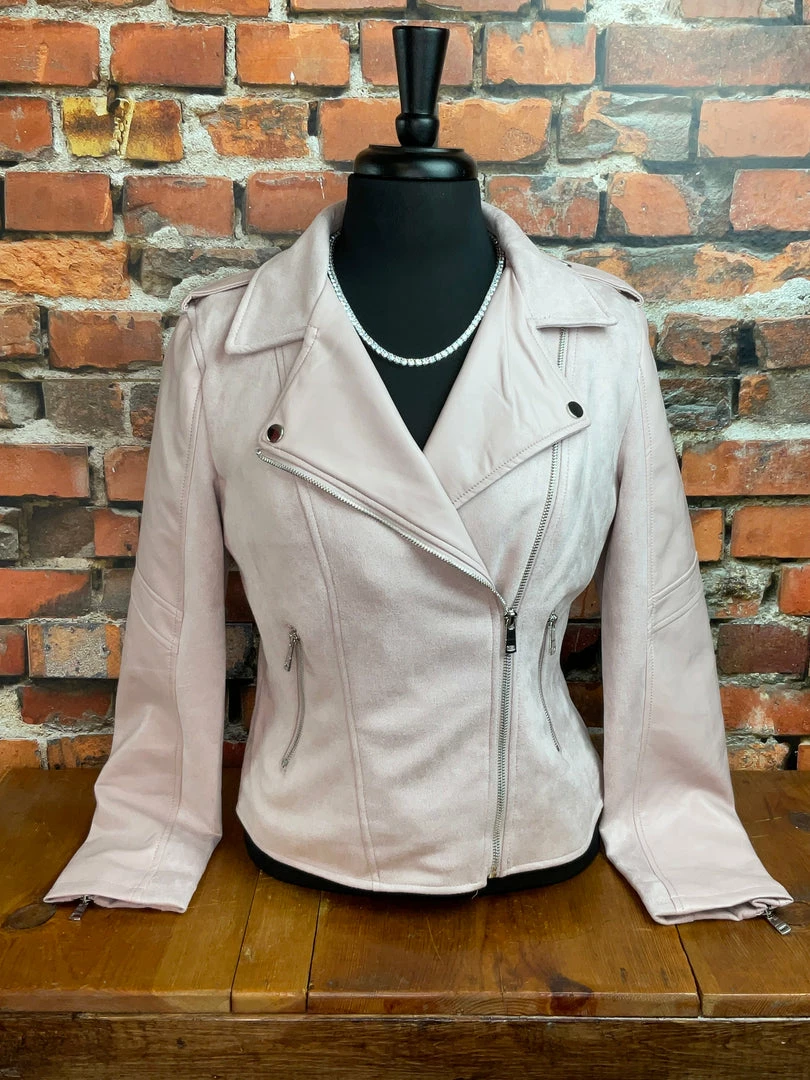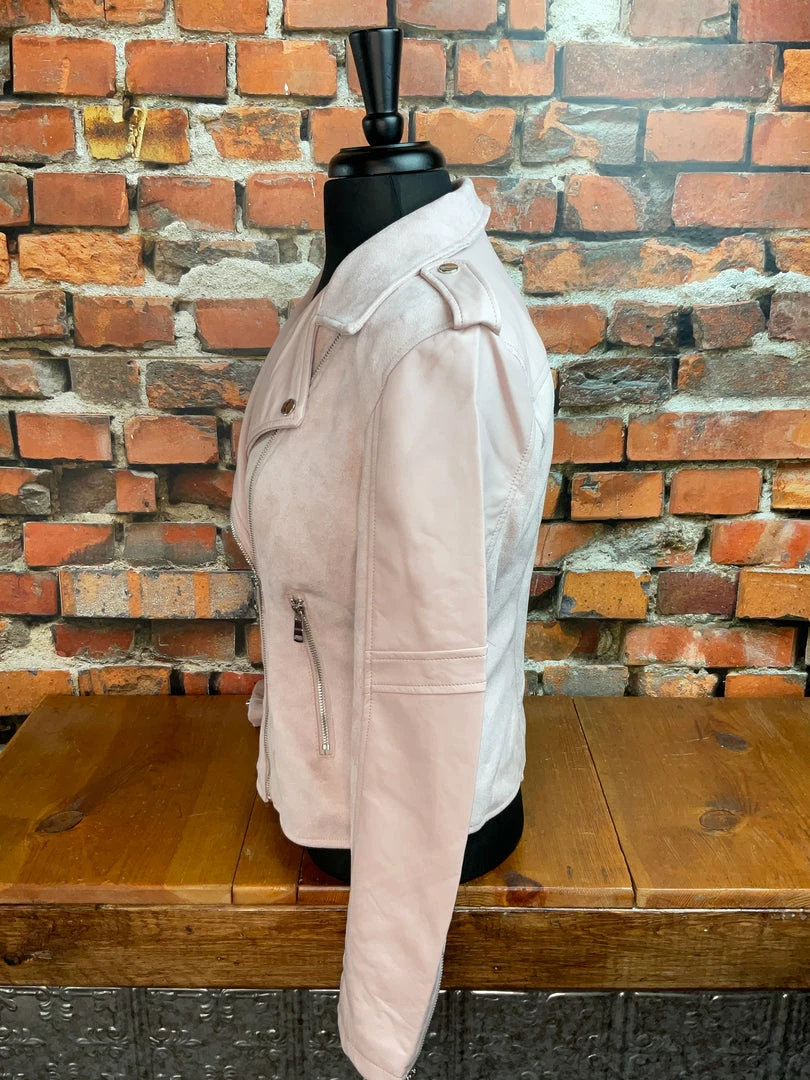A beautiful and delicate jacket with it’s soft suede-like feel and supple leather compliment on the sleeves.Β Β Featuring a front asymmetrical zipper closure, front zipper pockets andΒ cuffs.
