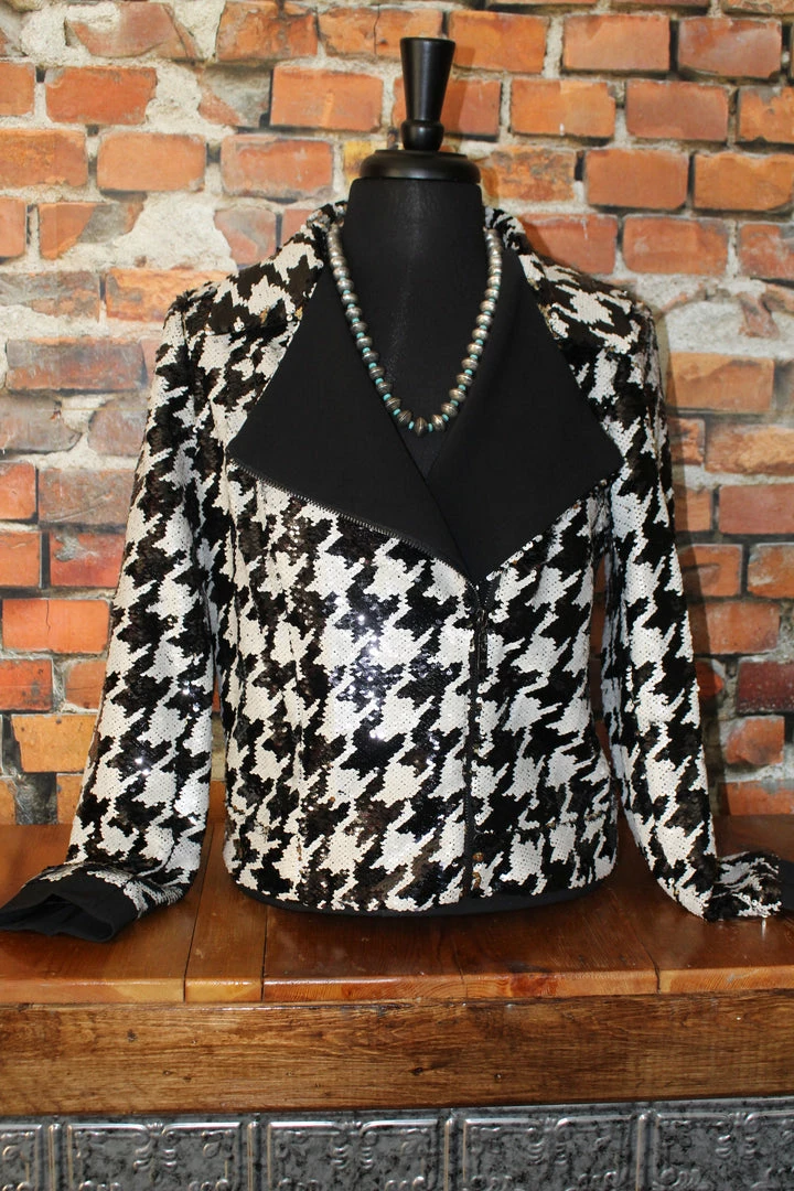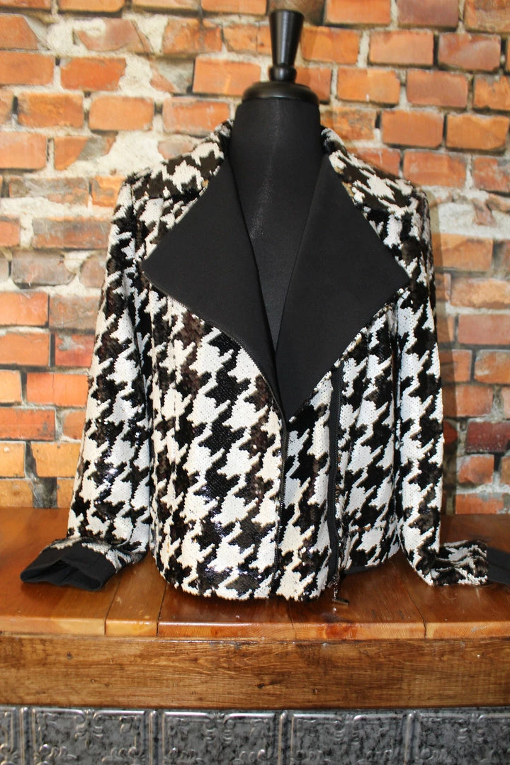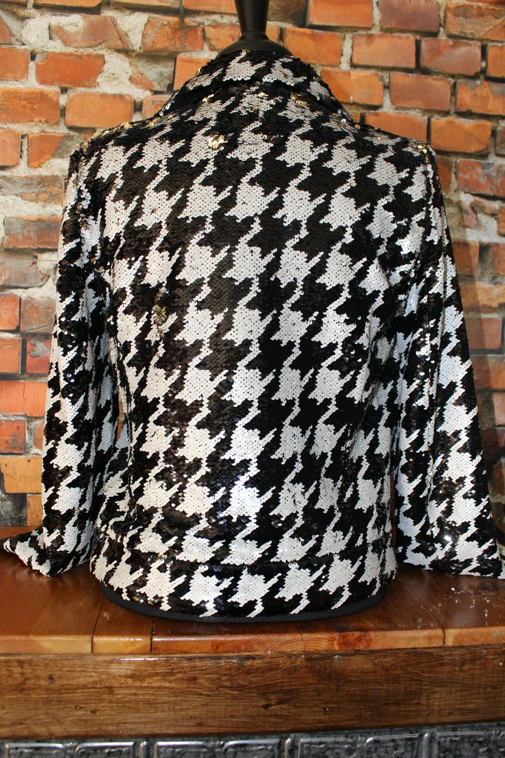 Black & Ivory sequins never looked so good together.Β The pattern and style of this jacket says “smart and sassy” all the way!Β Β