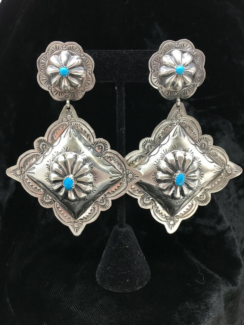 If you like bling, then these are the earrings for you. Accented with beautiful sleeping beauty turquoise stones, these sure are to be compliment getters.
