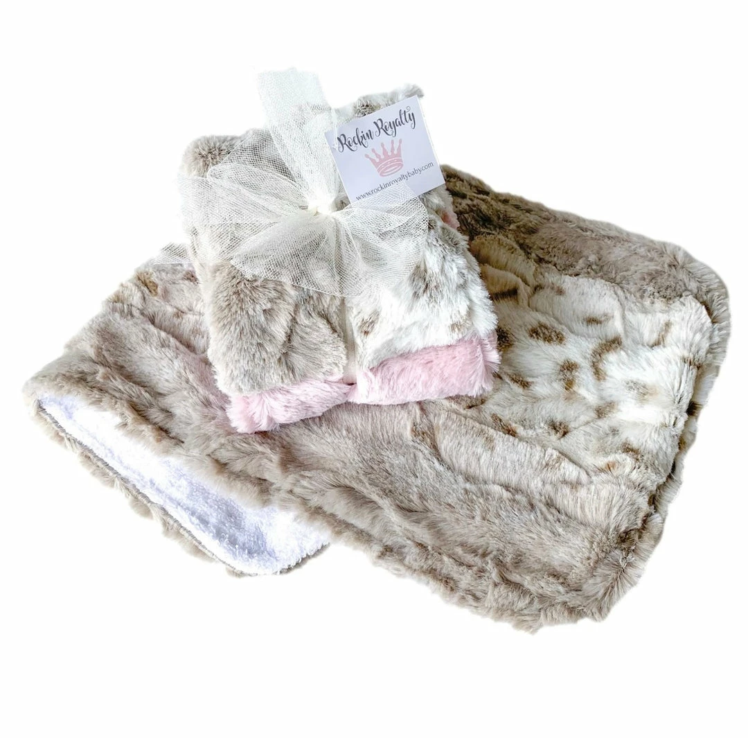 Plush Burp Cloth set of 2 in coordinating prints. These sets are backsd with thick terry cloth material for optimal absorption. These Rockin Royalty Burp cloth sets make wonderful baby gifts.