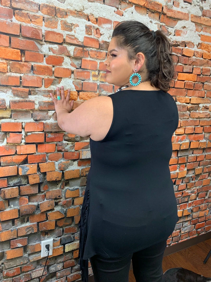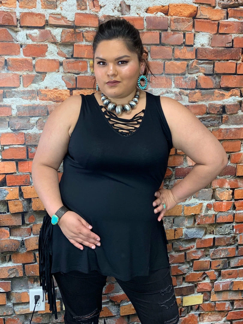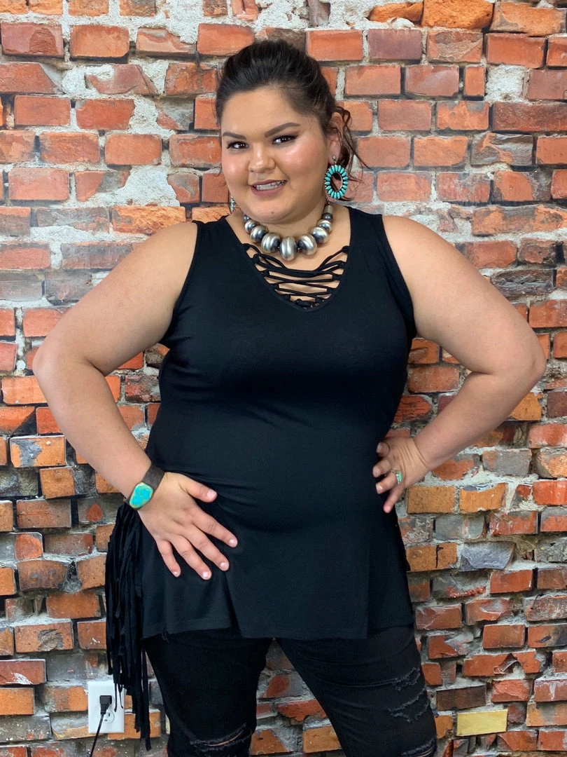 If you are in need of a sassy and edgy tank for the summer, look no further! Detailed with a lace up neckline and fringe side seam. Pair with your favorite leather jacket to complete the look.Β