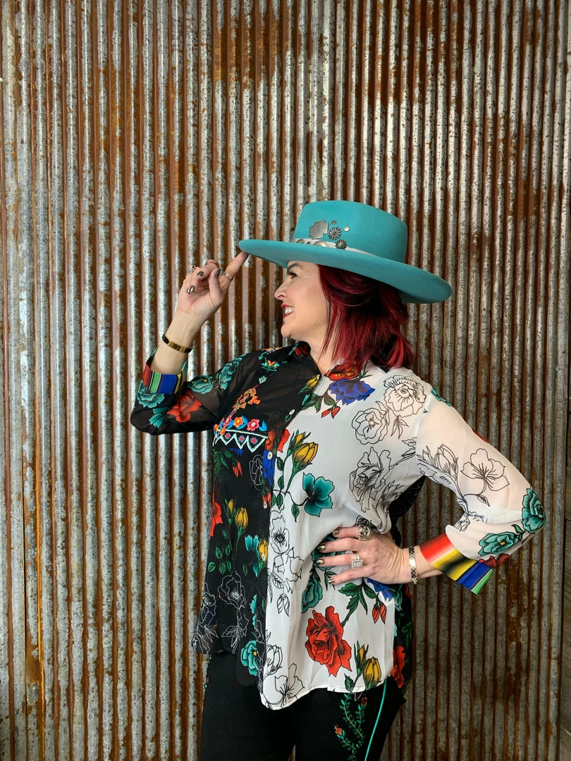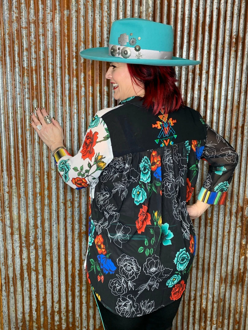 Beautiful sheer Chiffon top with button front closure. Black back and half black/half white front with contrasting flowers throughout. Embroidery, stripes and bold colors really make this a class act.